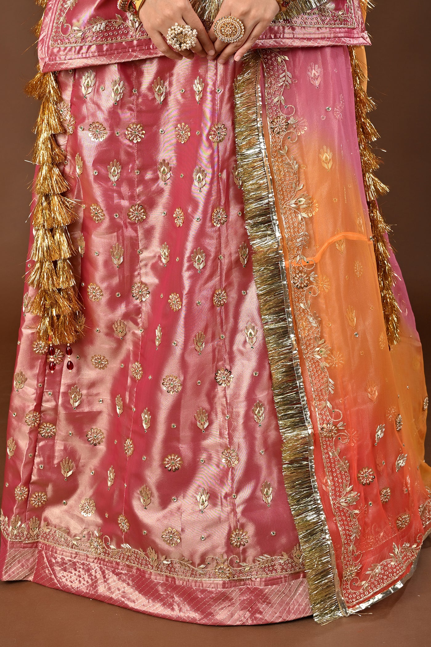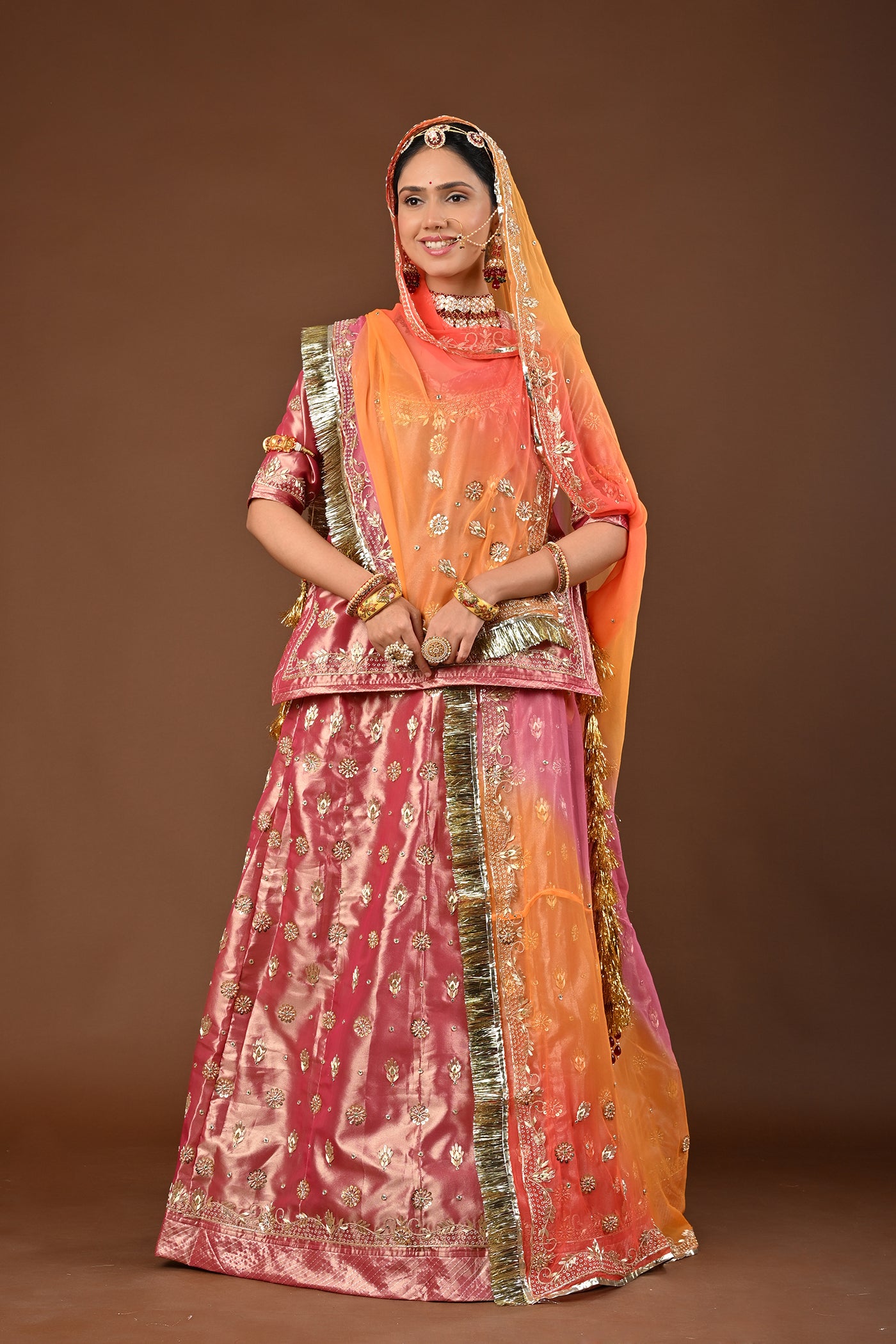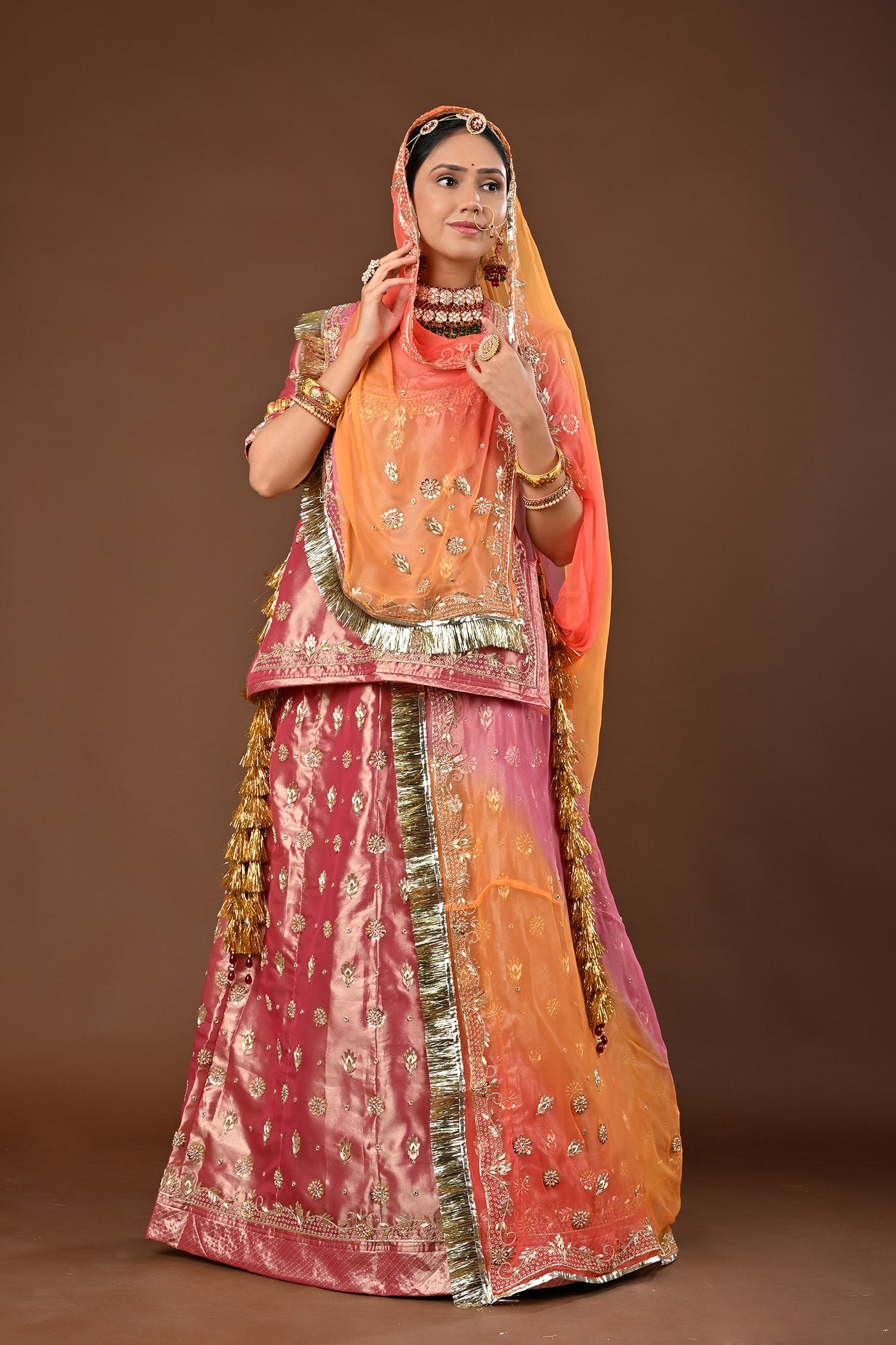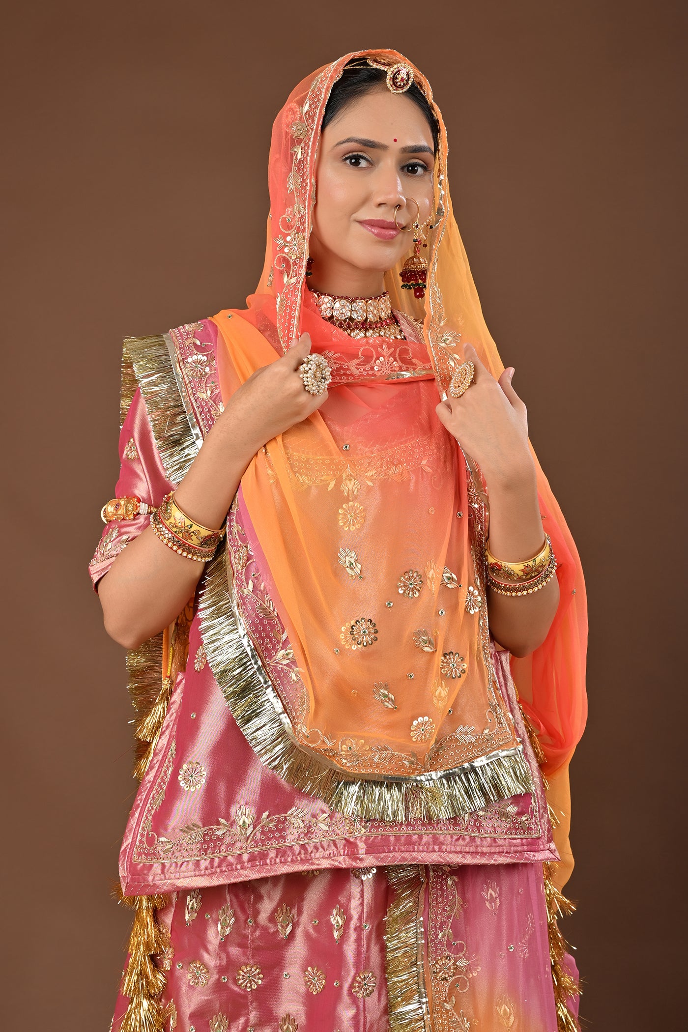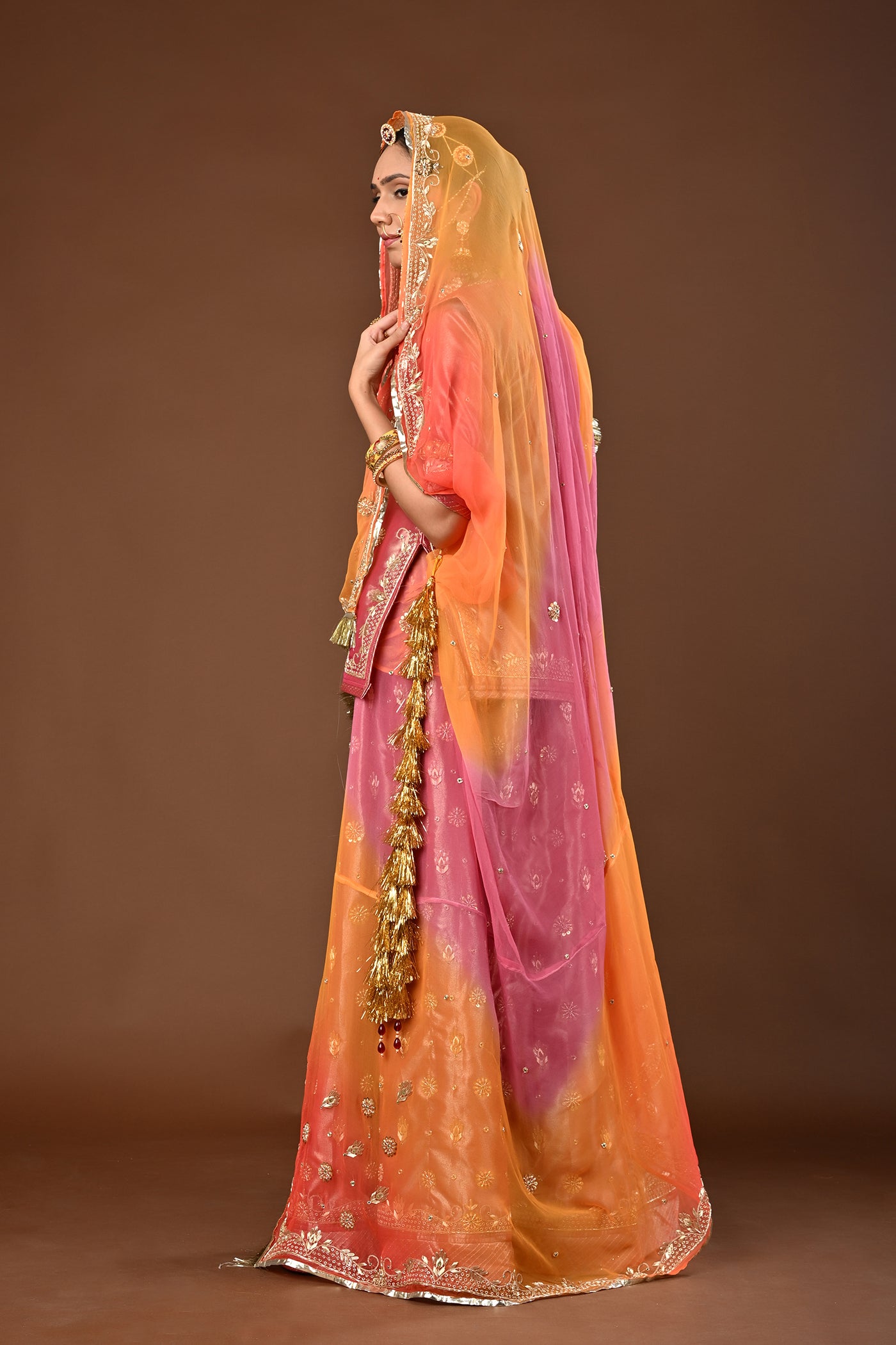 Designed for sophistication, this multi shaded odhna Rajputi Poshak in pure georgette highlights Zardozi. Ideal for festive, it offers grace and regal appeal. An elegant pick for brides and connoisseurs of handcrafted Indian wear.