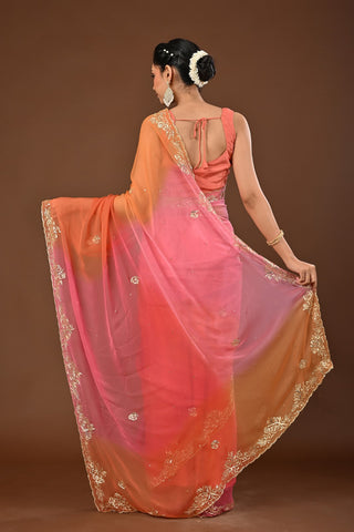 Shaded Rani Orange Platinum Chiffon Saree with Aari Kasab Jaal Highlight Kardhana with Zardozi Kasab Boota