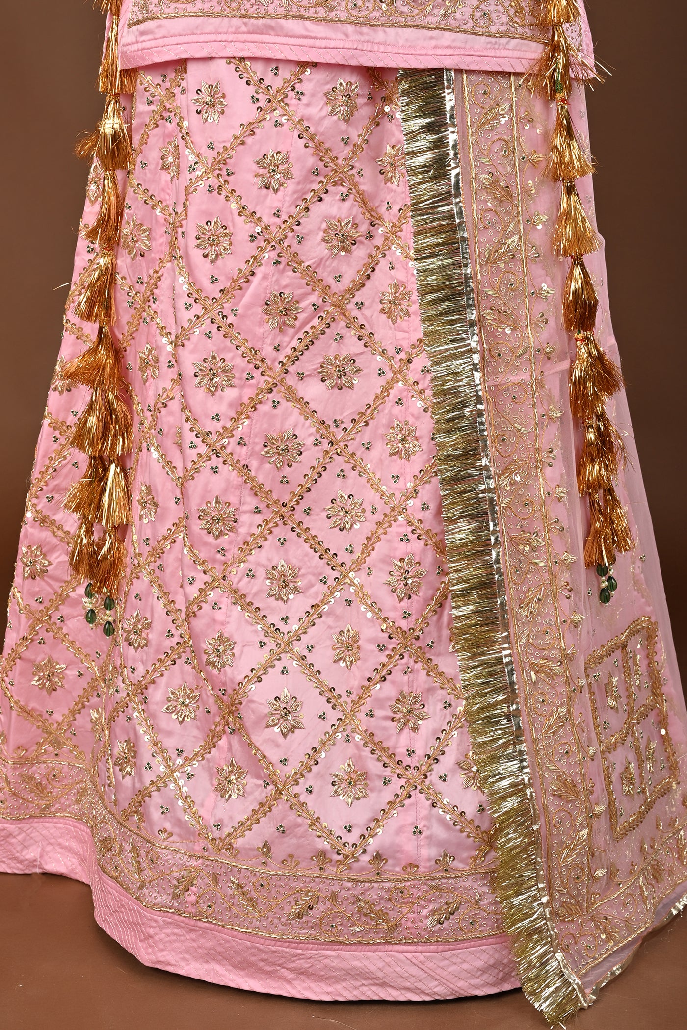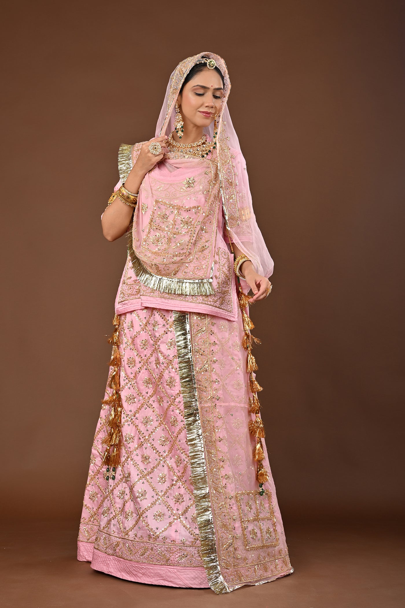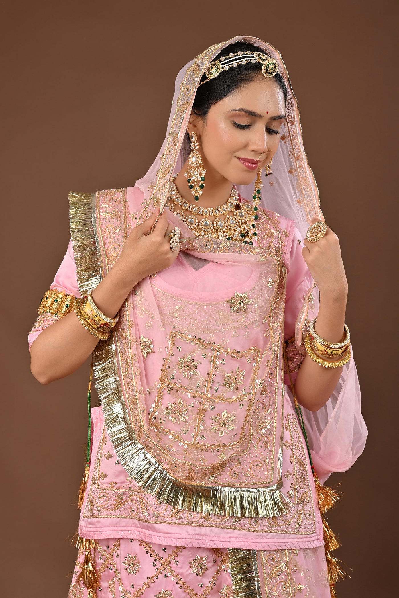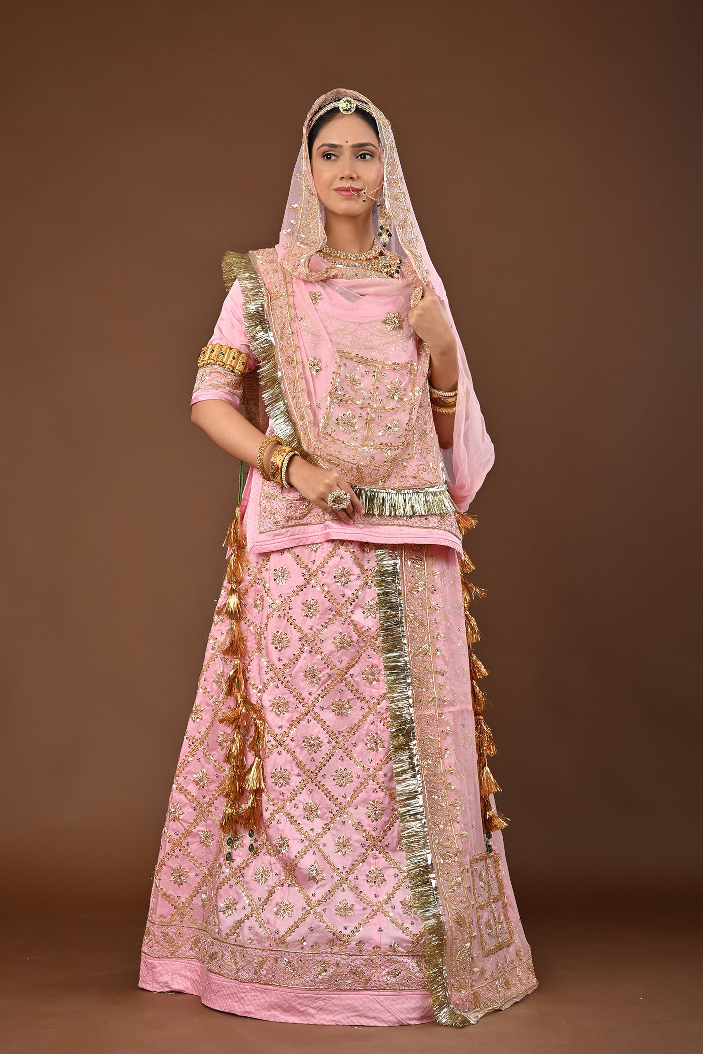 Step into elegance with this baby pink Rajputi Poshak crafted in pure georgette and enriched by Zardozi. Perfect for occasion wear, it reflects timeless Rajasthani artistry. A luxurious choice for weddings, festivities, and cultural celebrations.