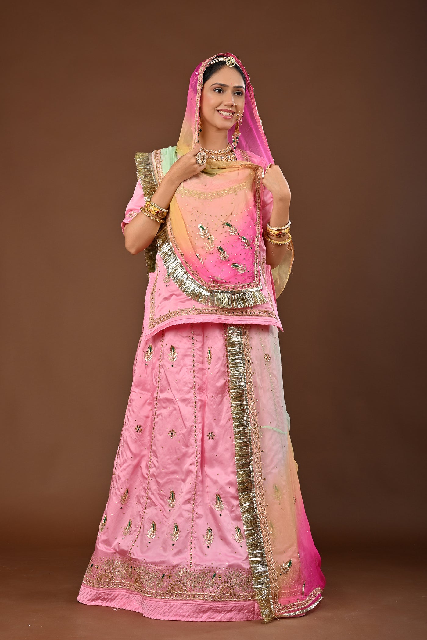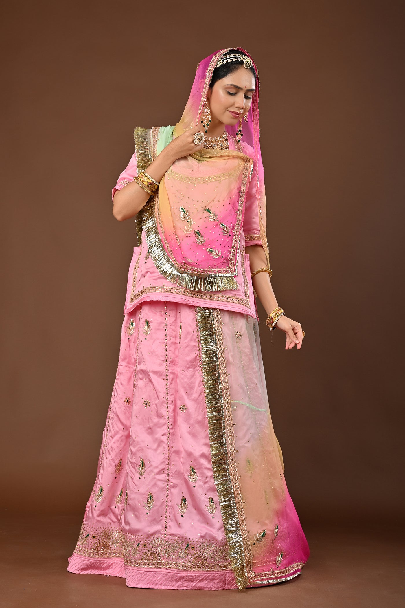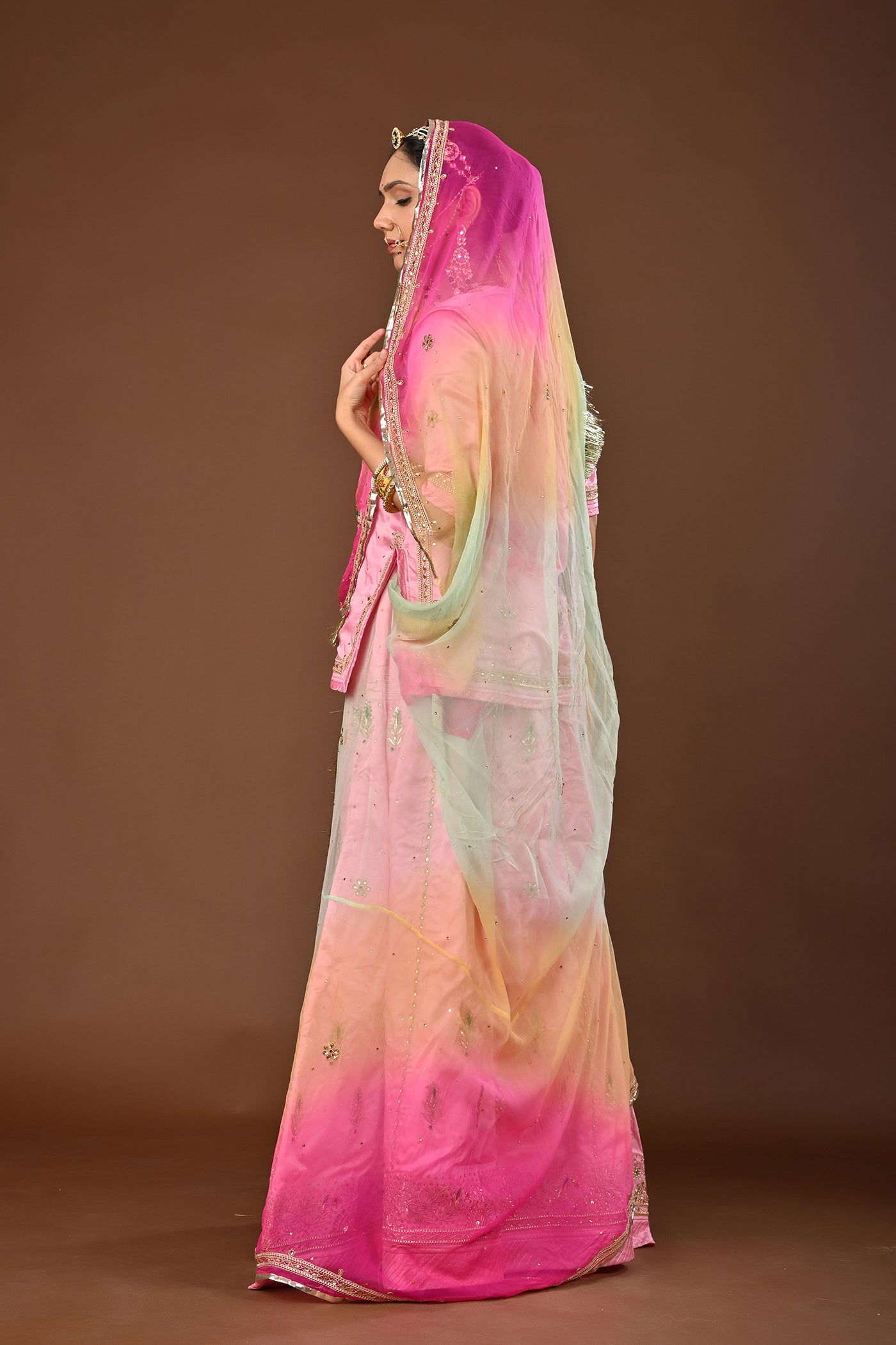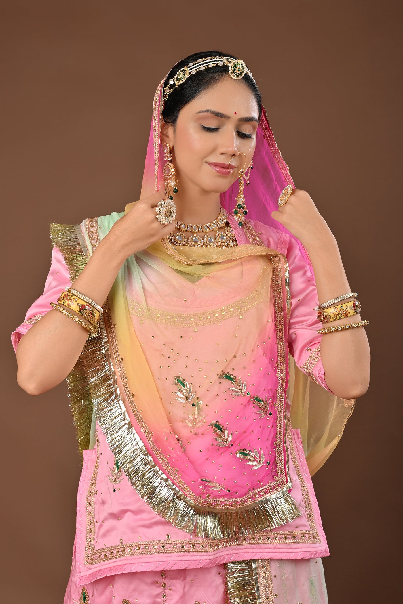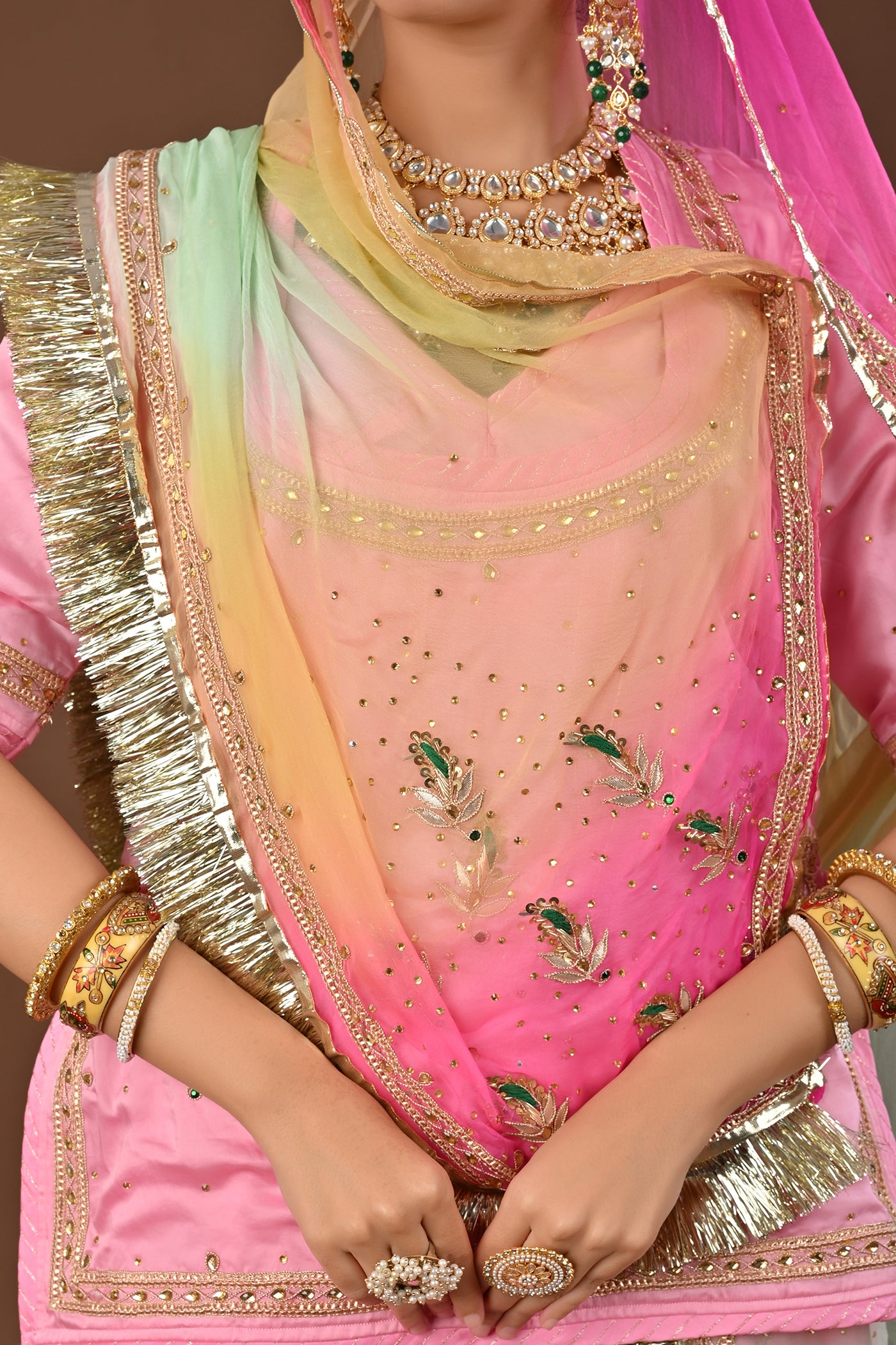 Radiating charm, this multi shaded odhna Rajputi Poshak is tailored in pure georgette and adorned with Kundan Gota Patti. A refined outfit for occasion wear, it blends heritage with modern style. An heirloom-worthy ensemble for women seeking authentic Rajputi Poshaks online.