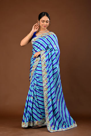 Designer Farozi Blue Tussar silk Saree adorned with Lehariya Saree with Aari Kasab with