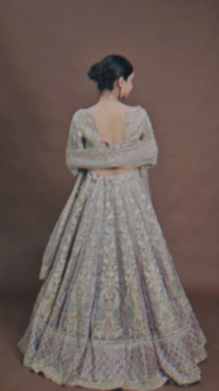 Timeless and versatile, this lightweight and fluid lehenga in sleek Ash Grey is detailed with Zari Embriodery with resham work. A beautiful option for wedding and festive occasions.