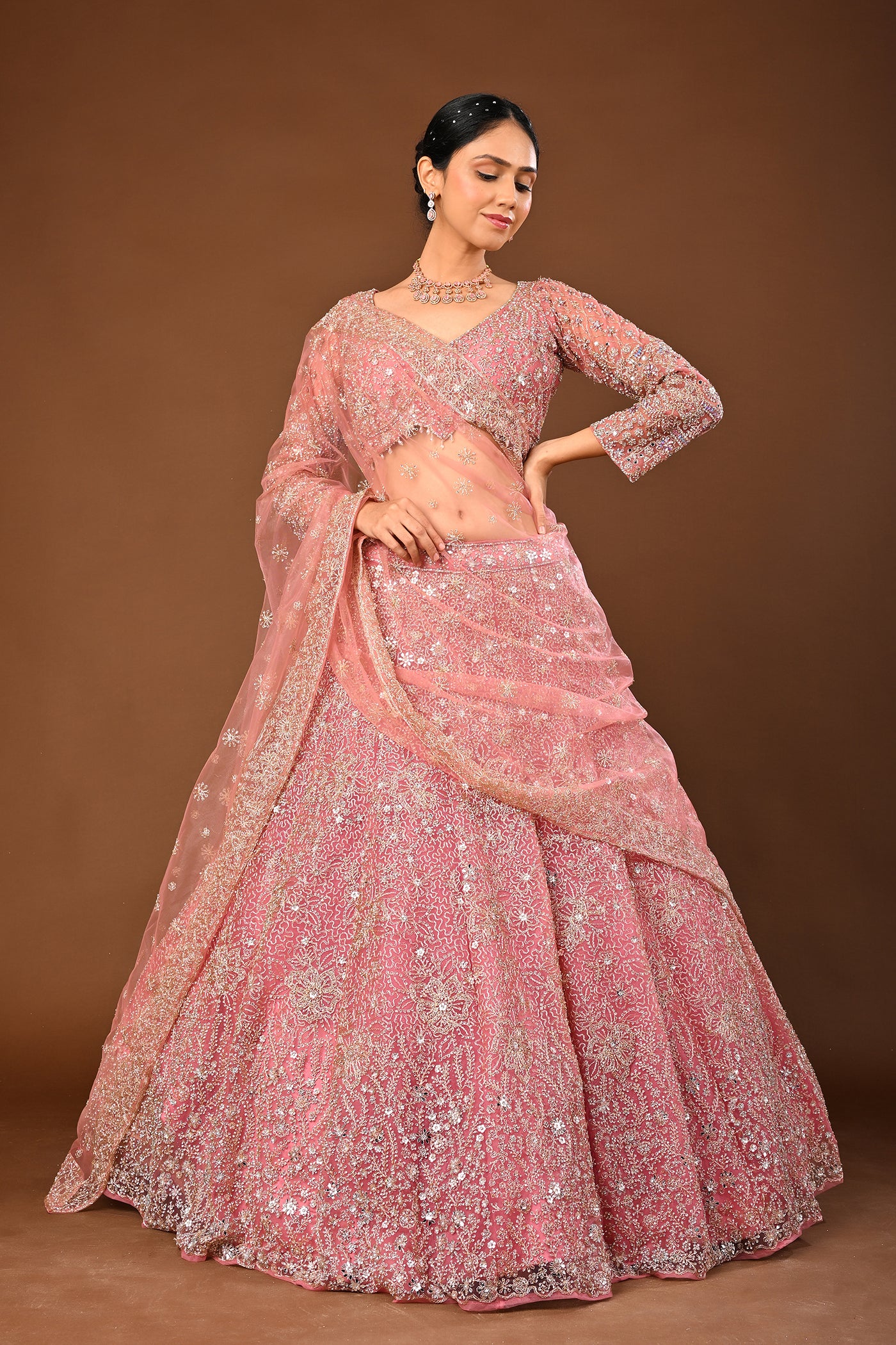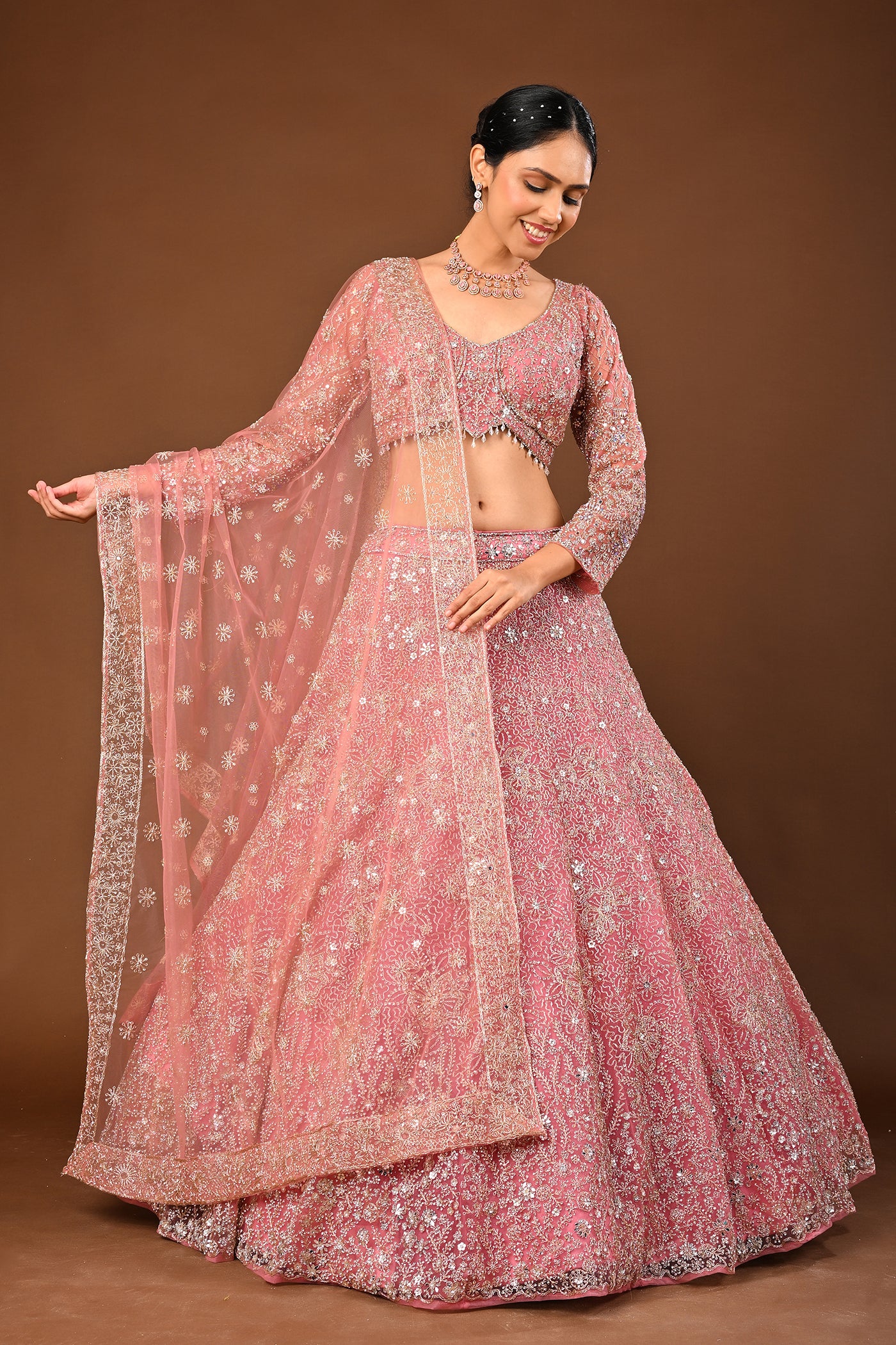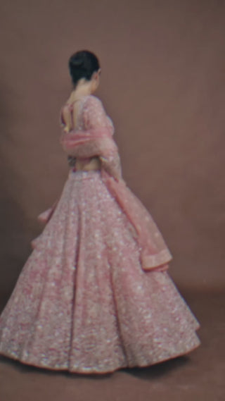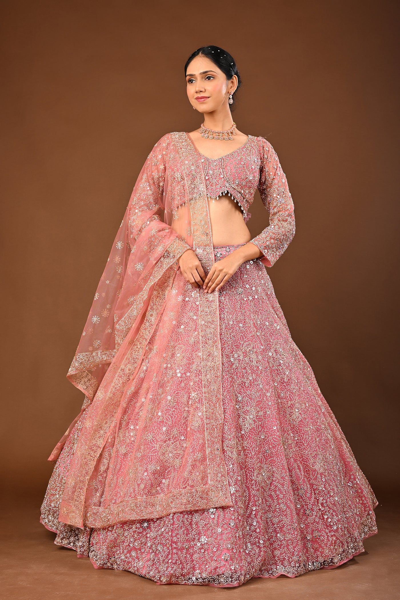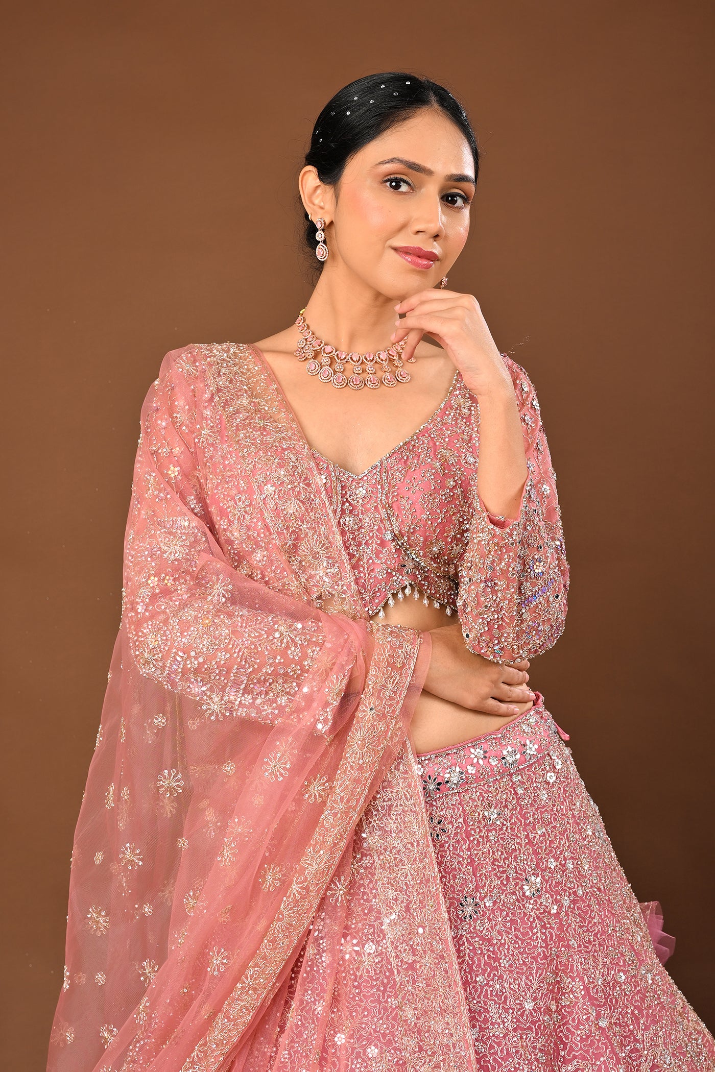 Effortless elegance defines this romantic Baby pink lehenga in soft net, finished with Stone work with mirror and zari. An elevated pick for weddings and festive functions.