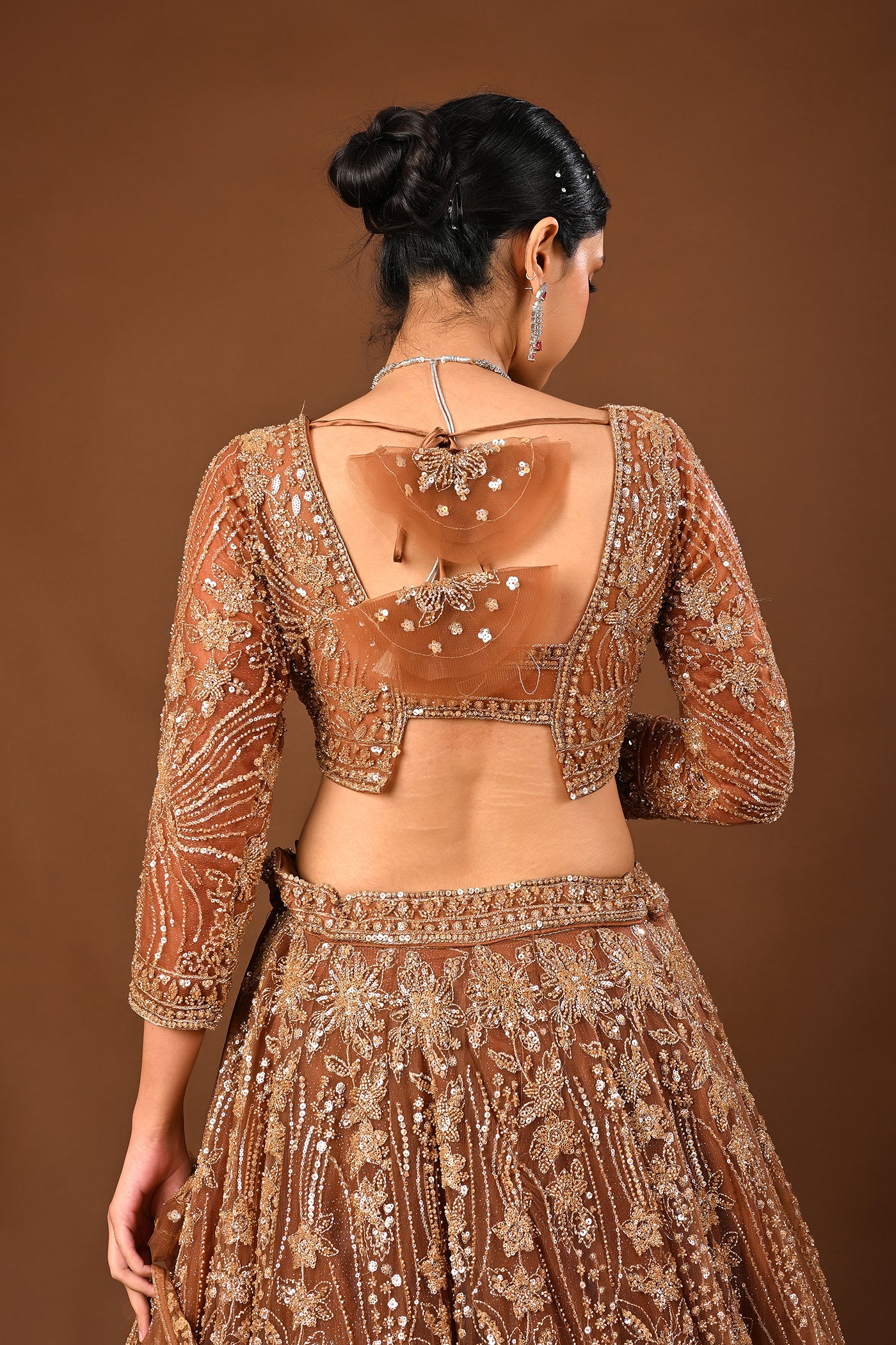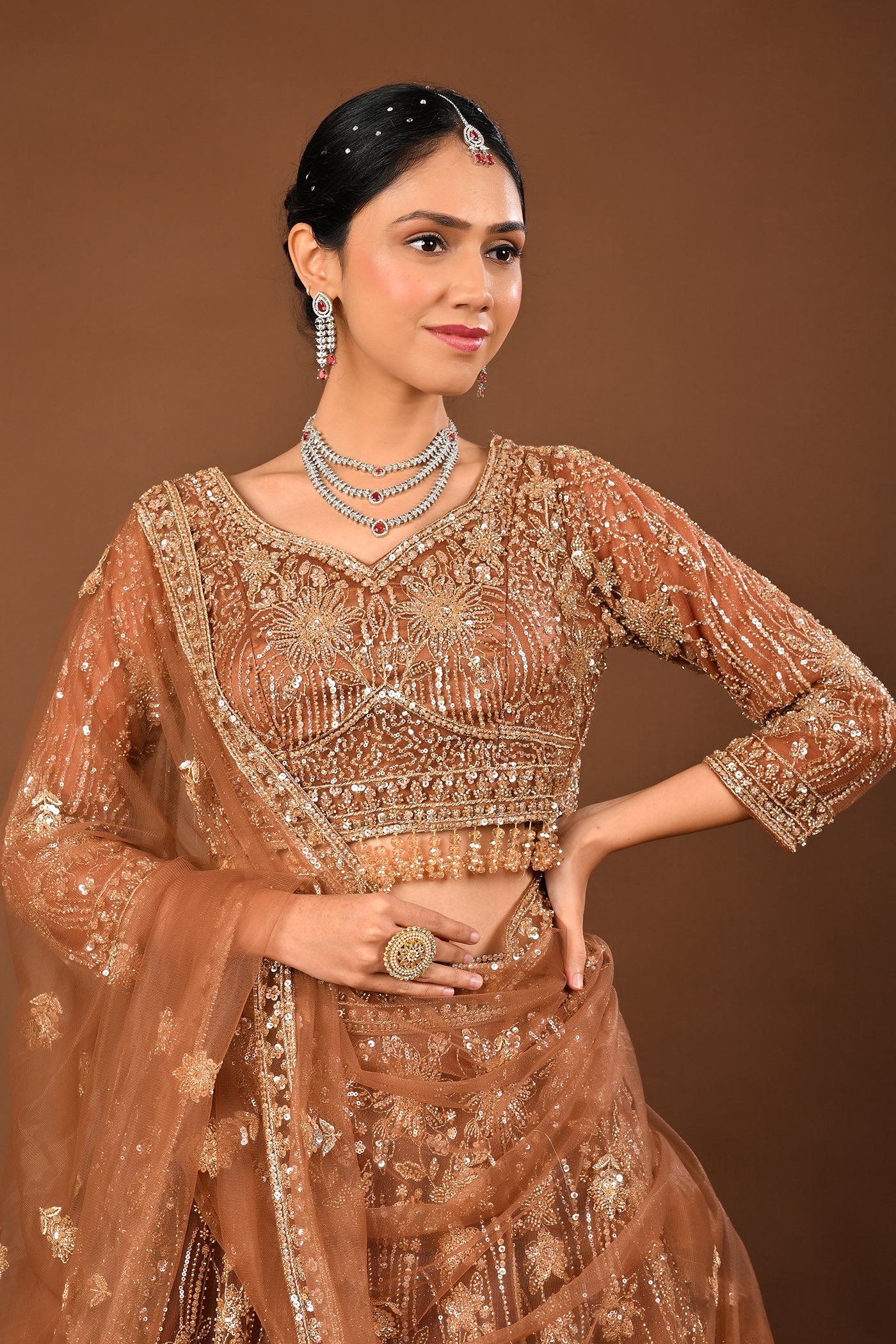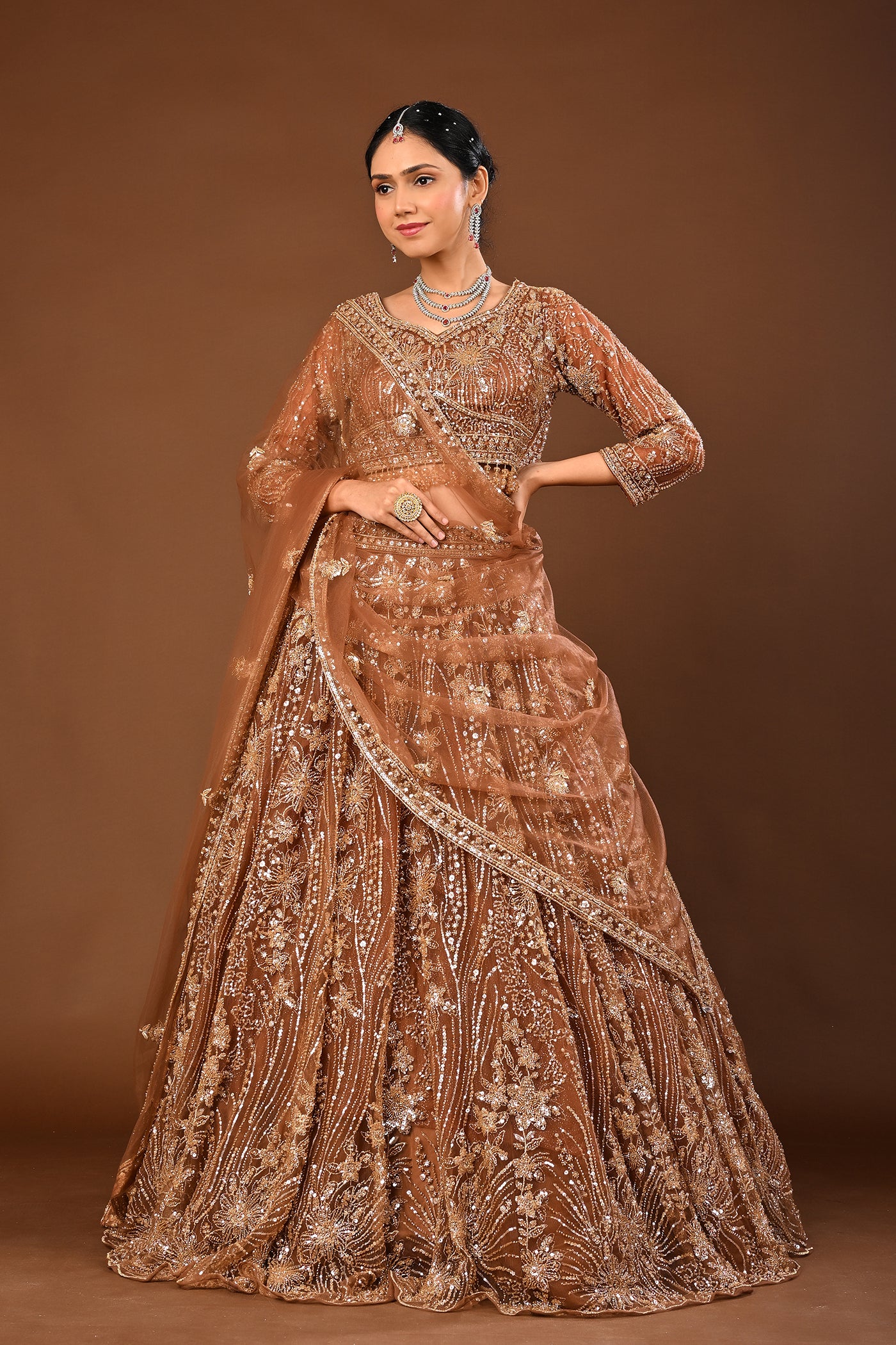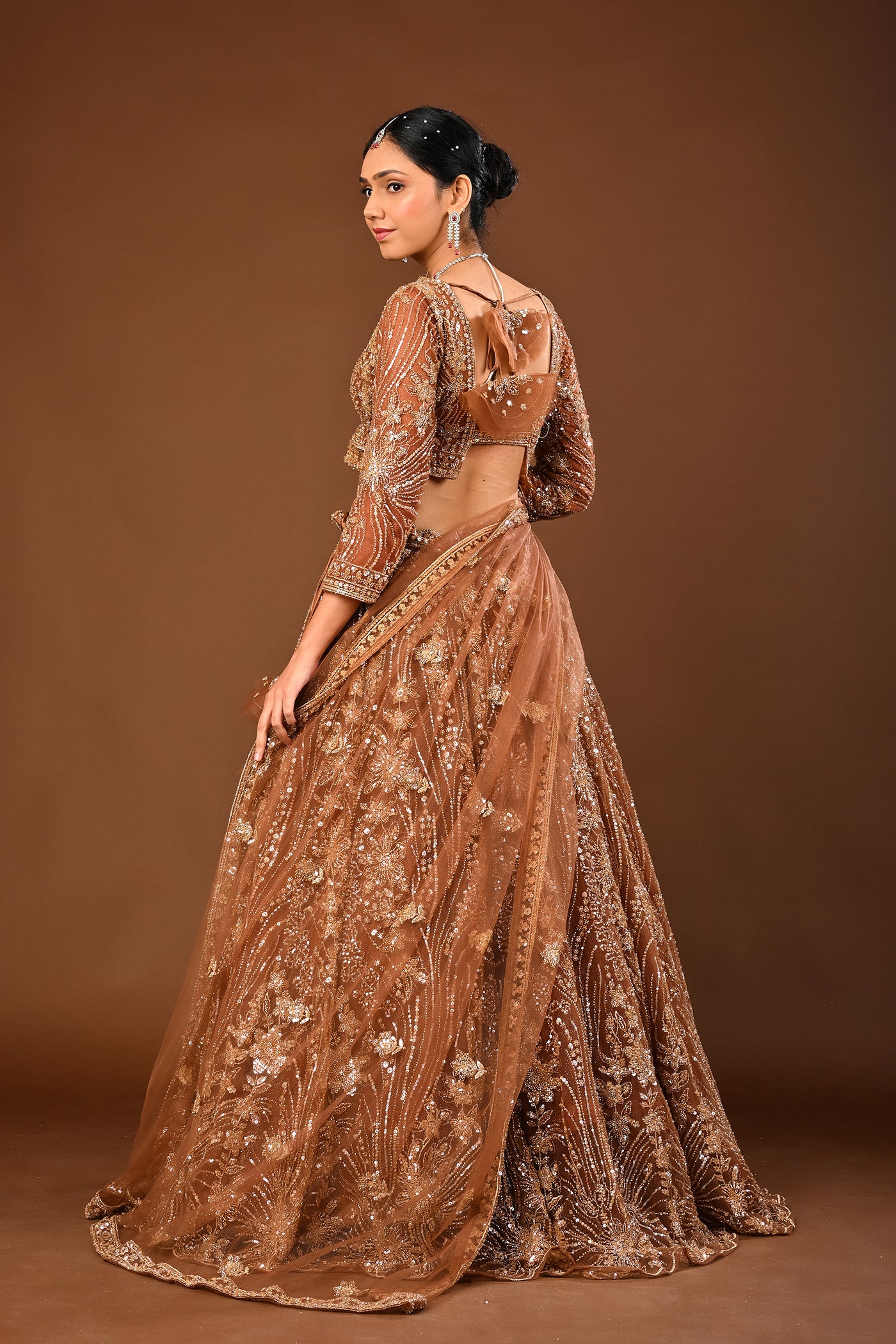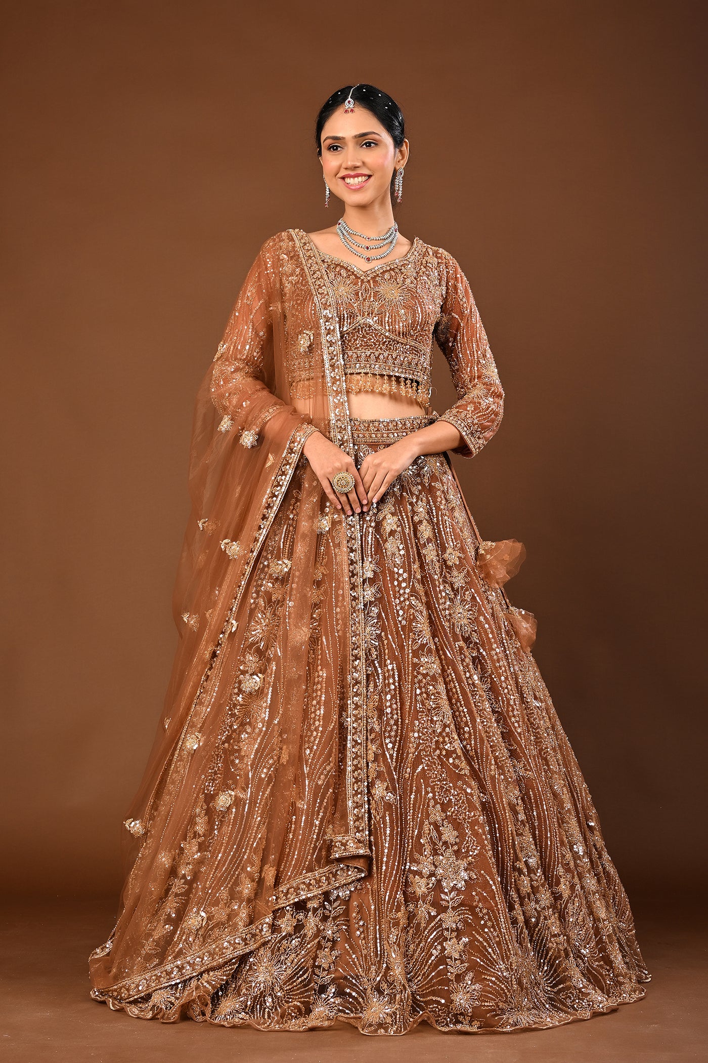 Sleek yet traditional, the warm Brown lehenga crafted in soft net reveals Cutdana, tubelight and beads work. A polished look for receptions, sangeet and evening celebrations.
