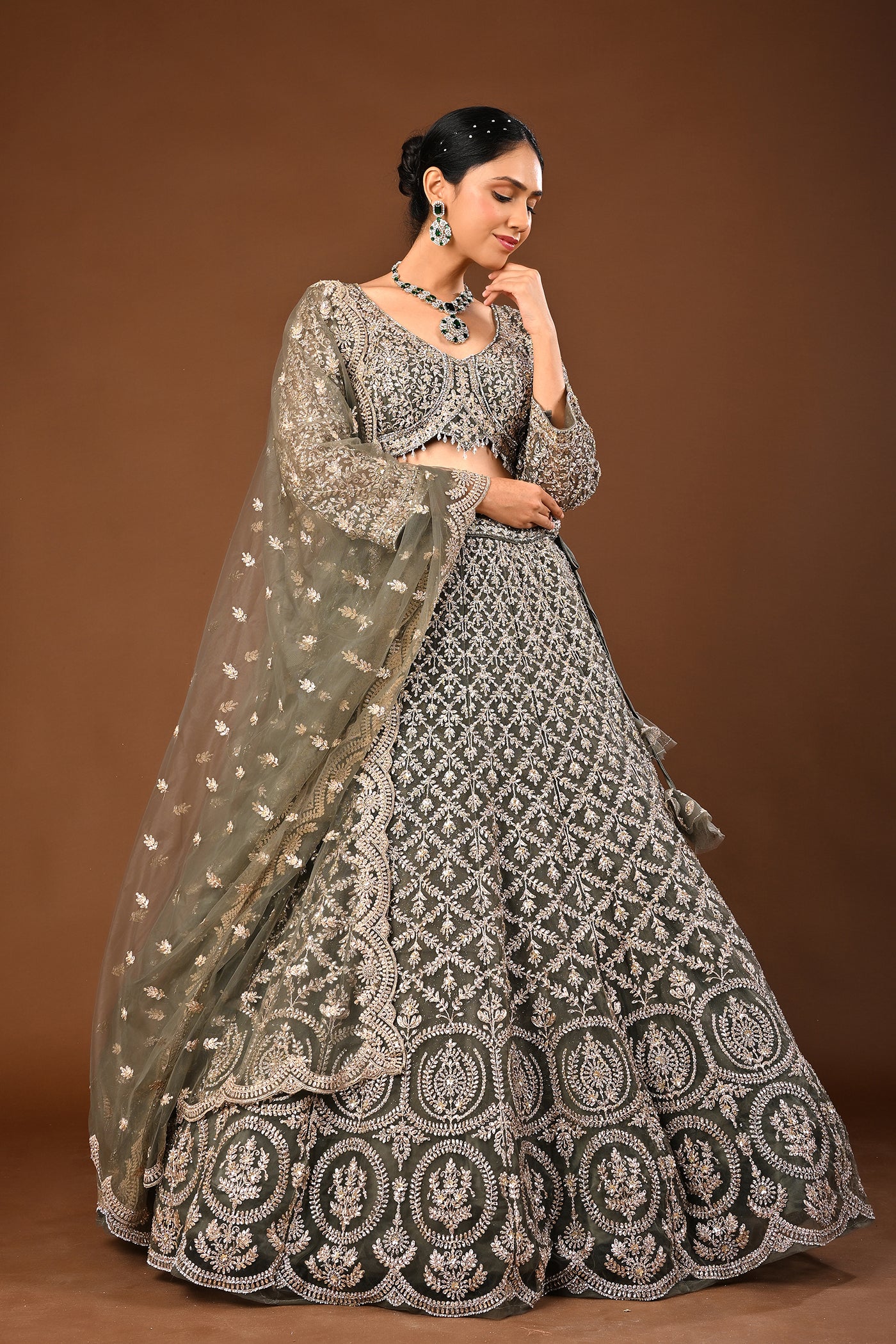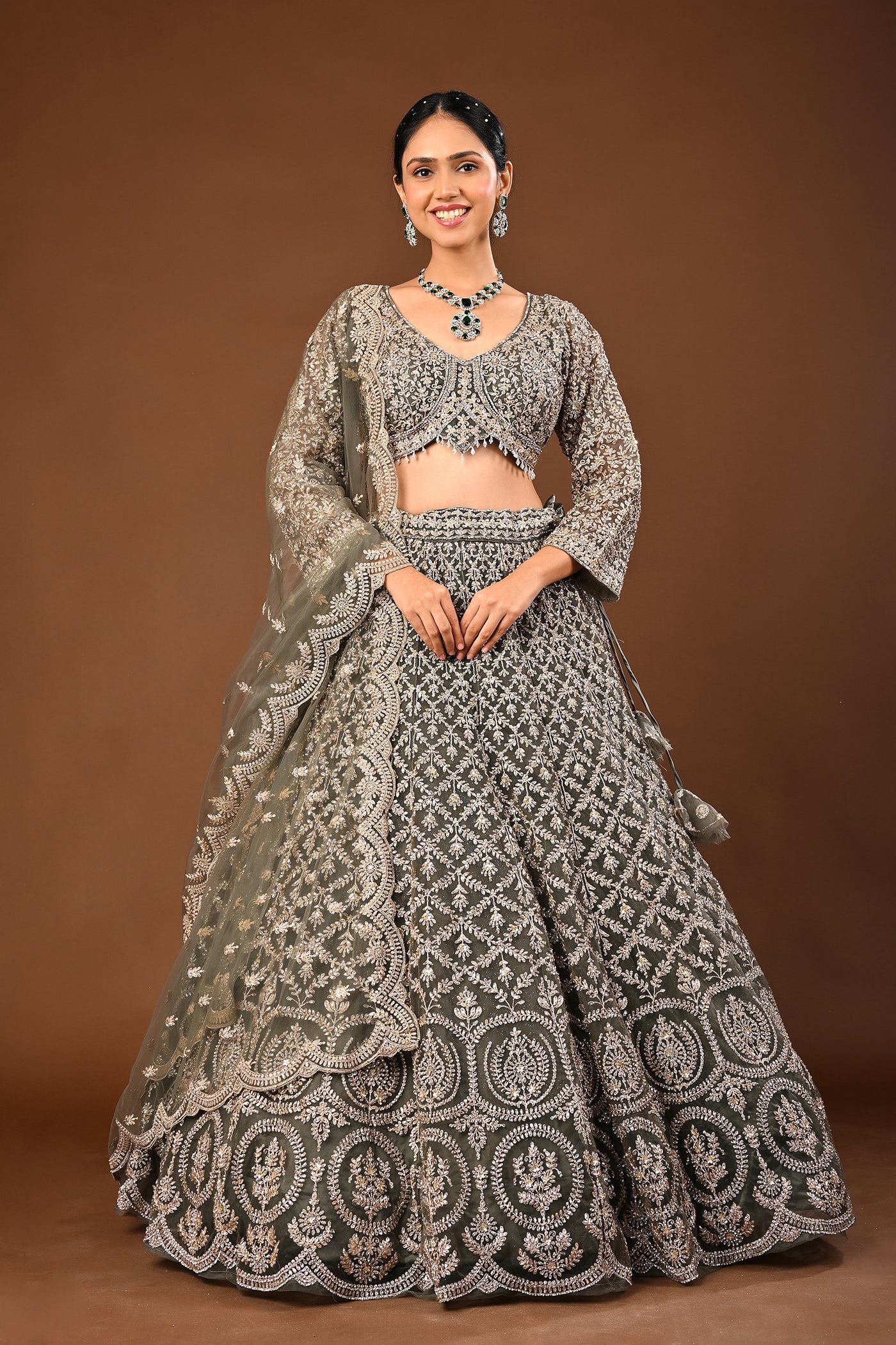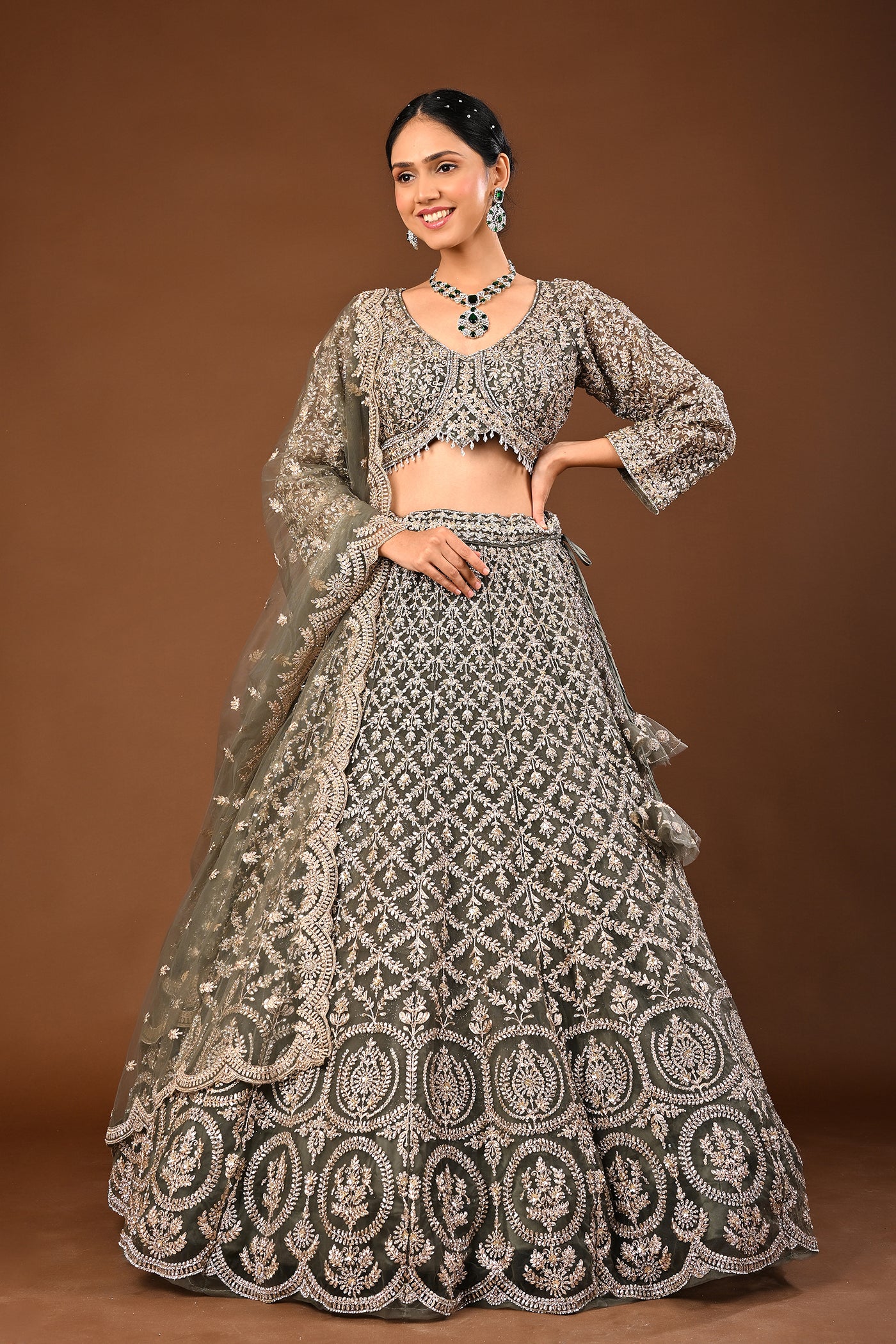 Understated luxury: a serene Mehandi green lehenga in soft net enhanced with Kundan and stone work. Suited to wedding and festive occasions.