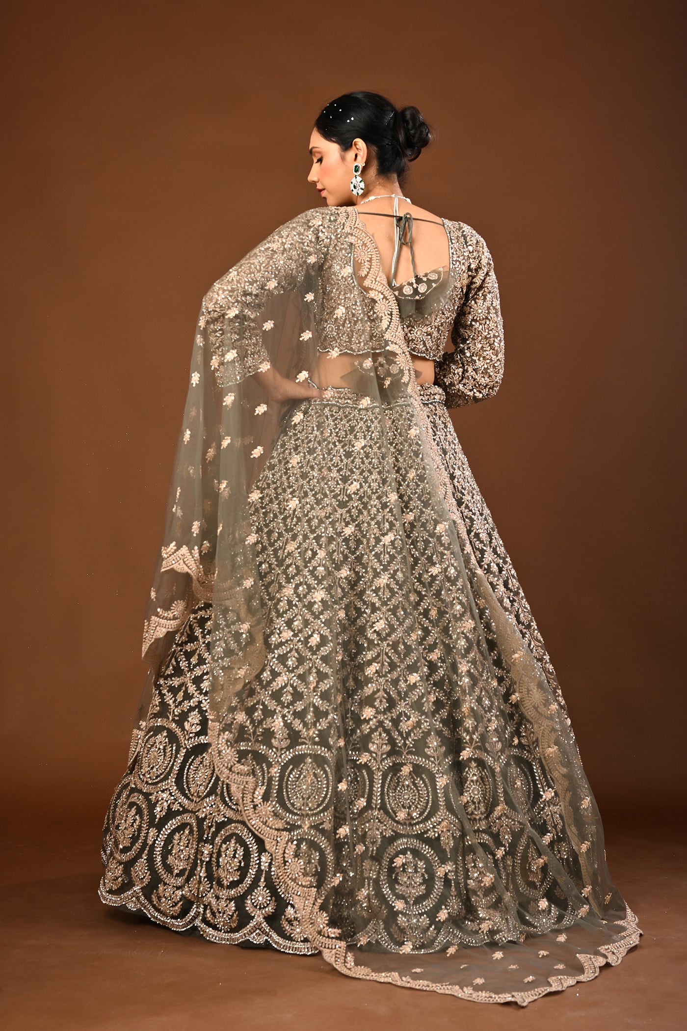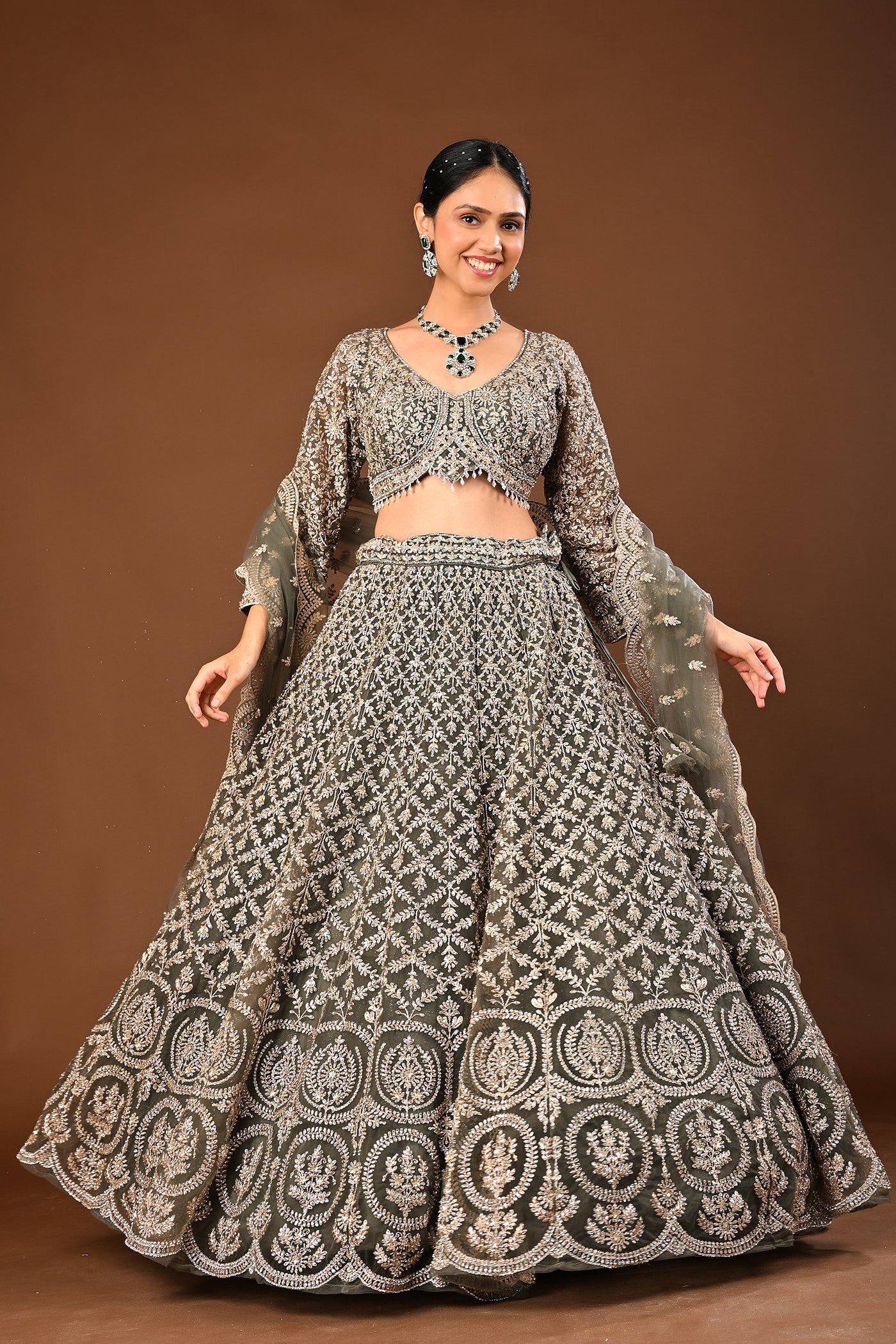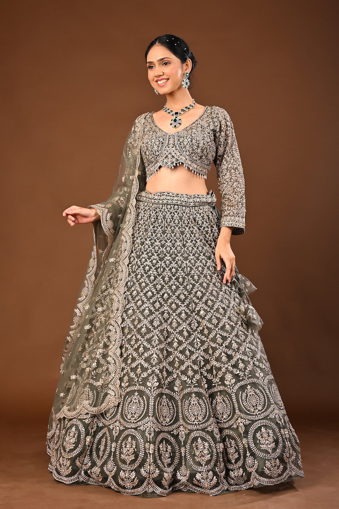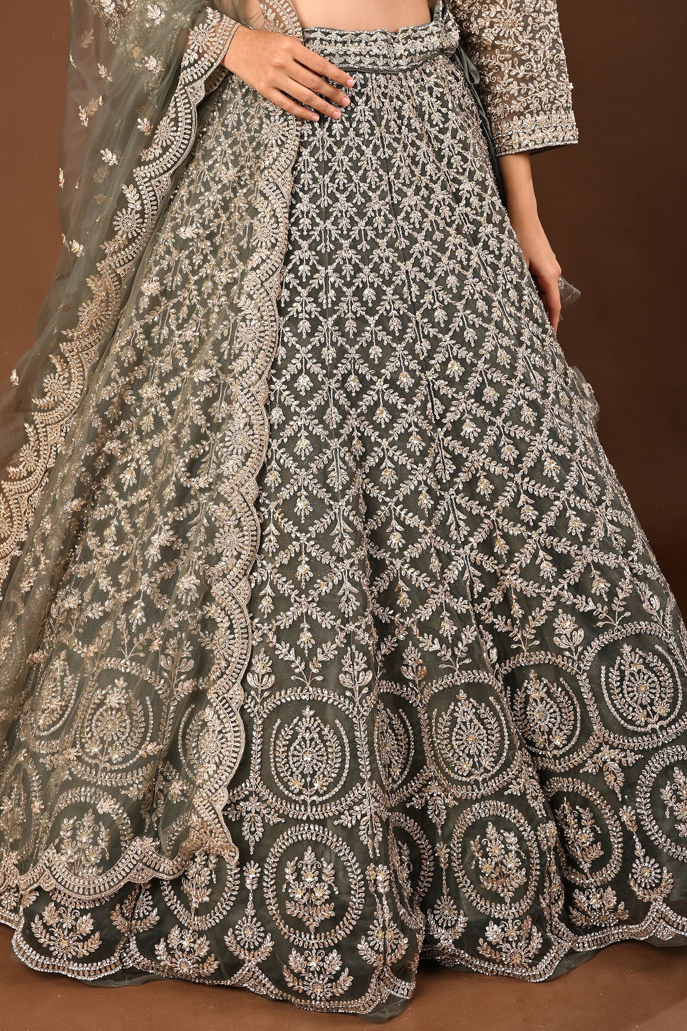 Understated luxury: a serene Mehandi green lehenga in soft net enhanced with Kundan and stone work. Suited to wedding and festive occasions.