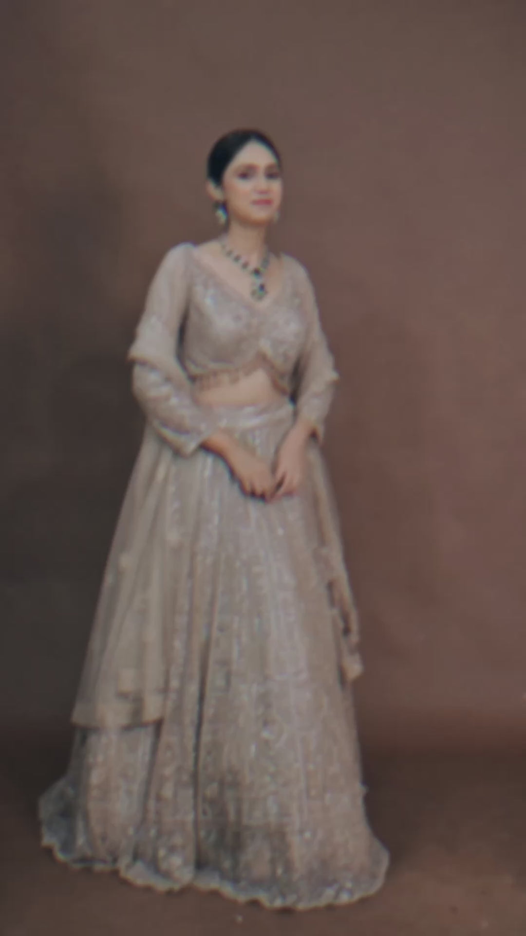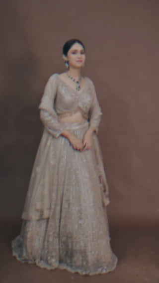 An ode to heritage, the understated Golden Brown skin tone / beige lehenga in soft net showcases Hand Pearl with Cutdana and sequins. A refined pick for receptions, sangeet and evening celebrations.