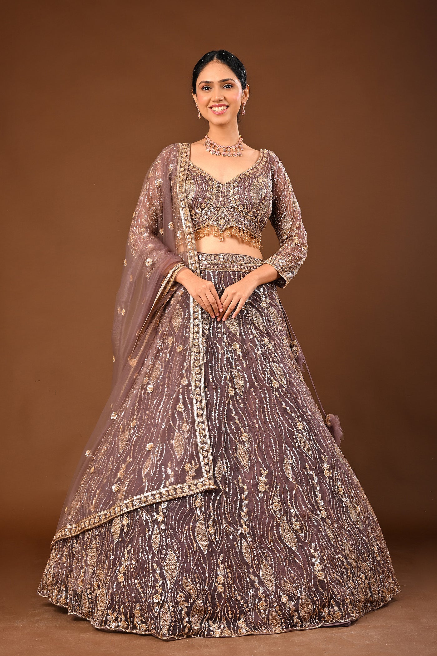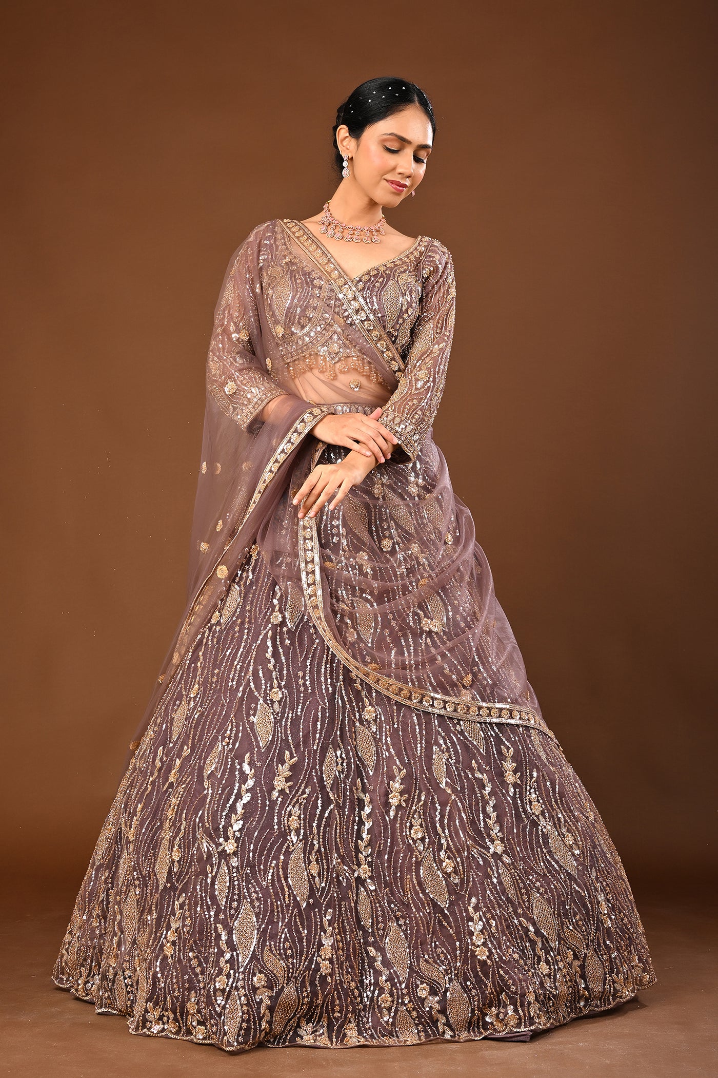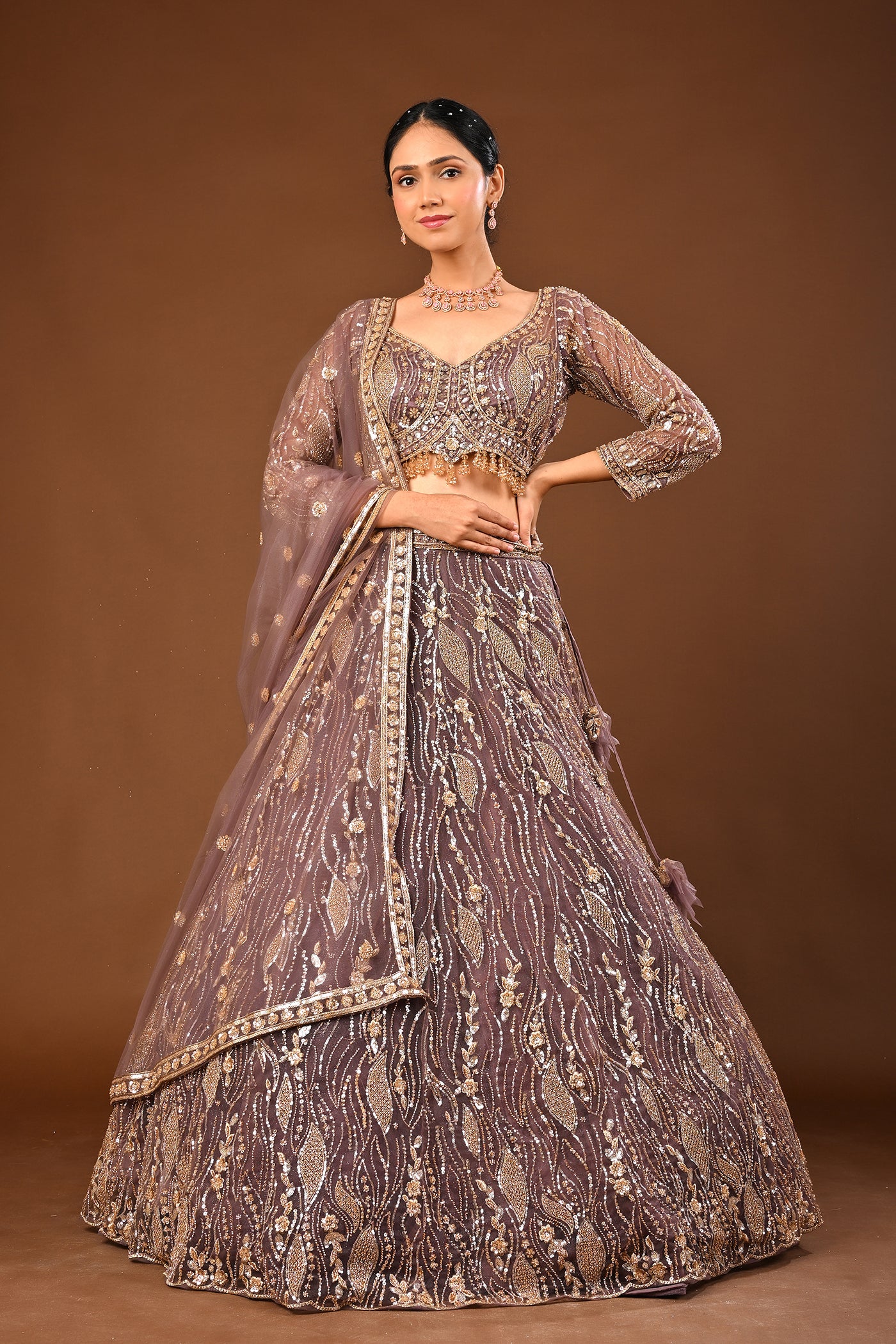 Gracefully tailored, this soft MAUVE lehenga comes in soft net with Cutdana, tubelight and sequins work. Ideal for receptions, sangeet and evening celebrations.