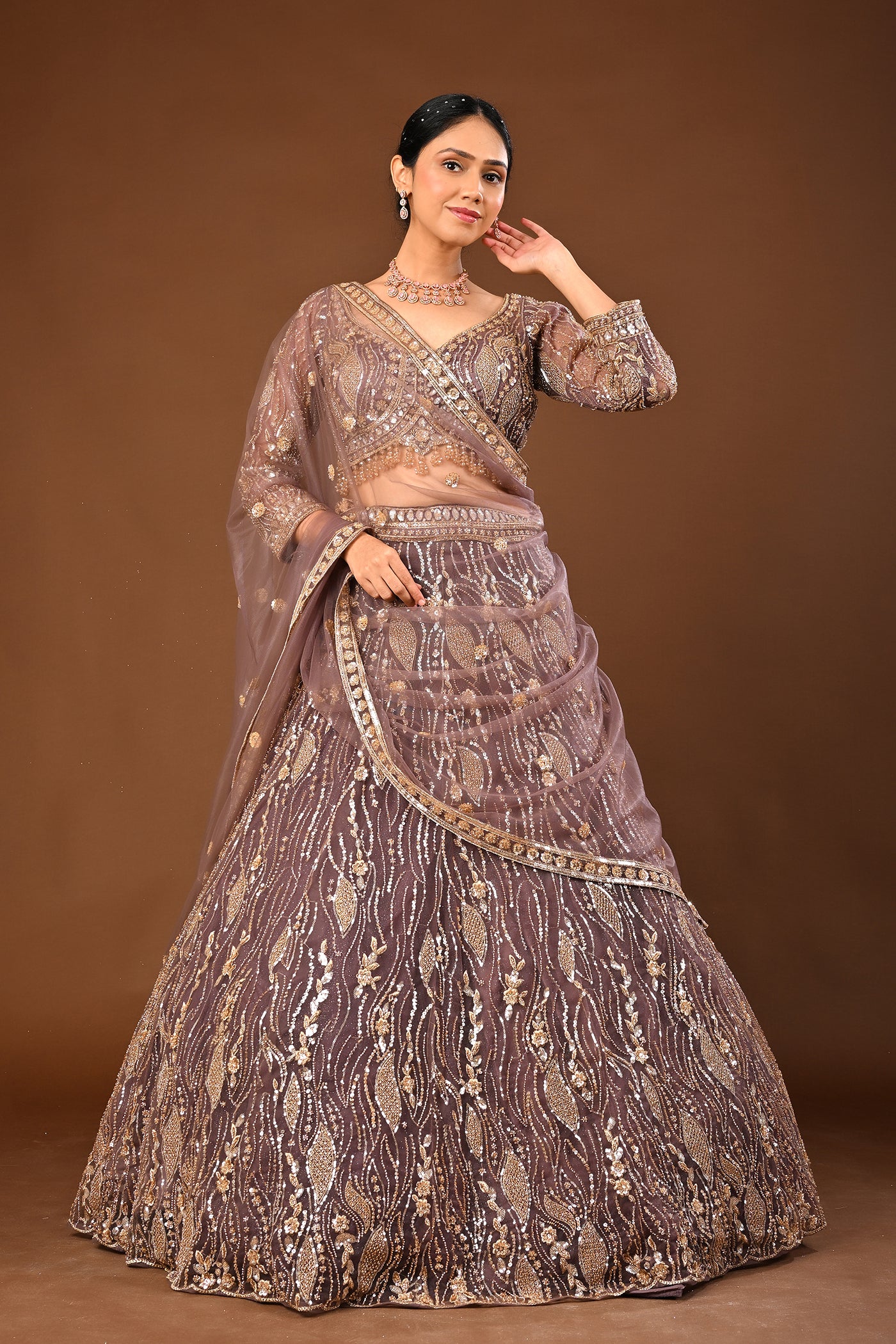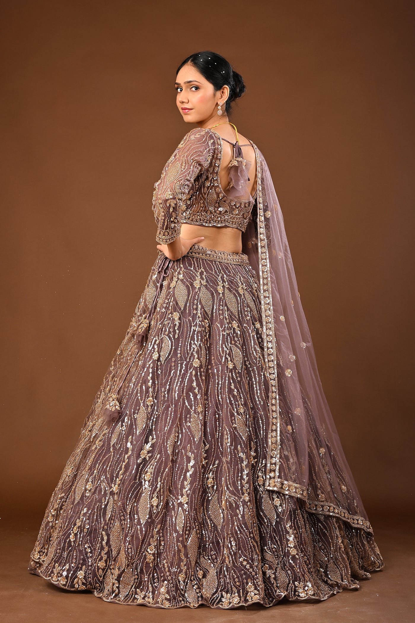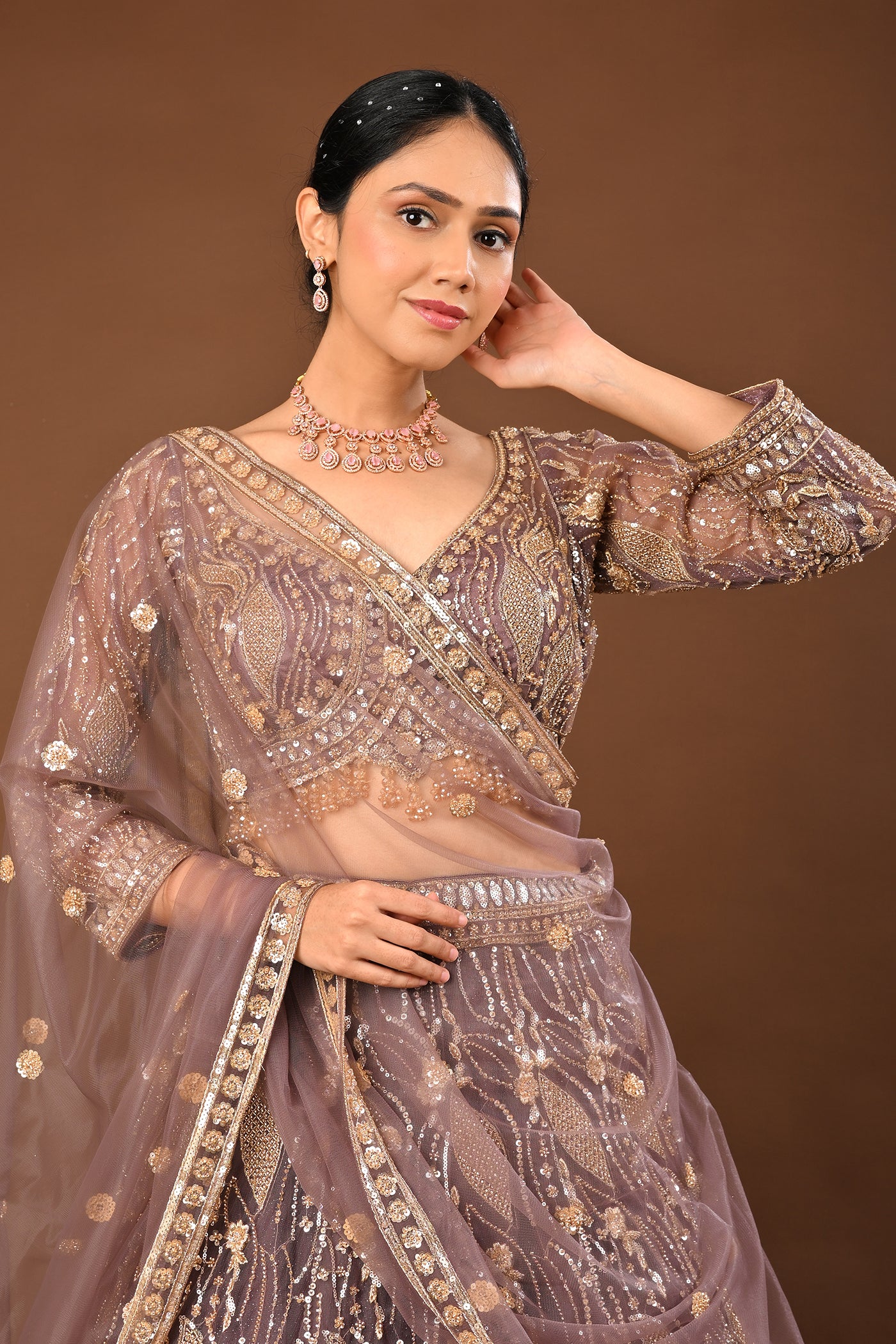 Gracefully tailored, this soft MAUVE lehenga comes in soft net with Cutdana, tubelight and sequins work. Ideal for receptions, sangeet and evening celebrations.