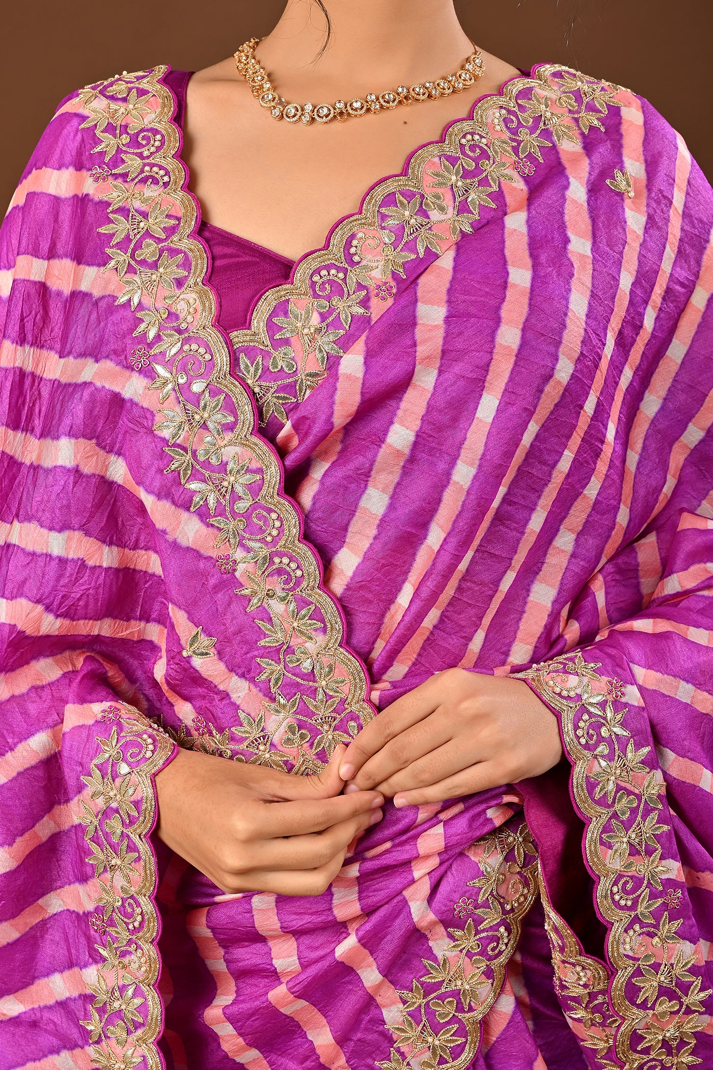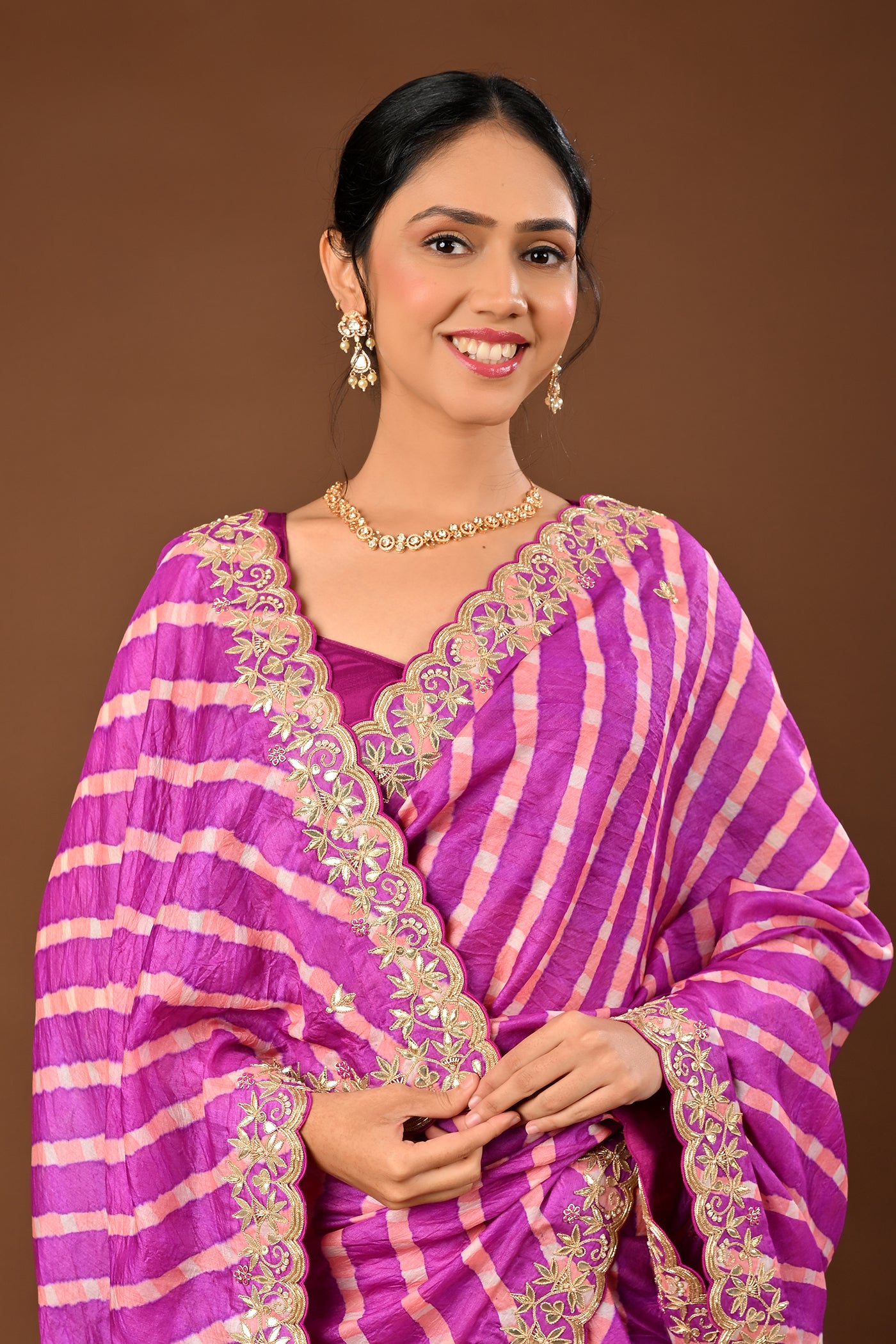 Timeless and versatile, this textured tussar sheen saree in delicate Megenta and Peach Color is detailed with Lehariya Saree with Marodi, gota and zardozi work. A beautiful option for weddings and festive functions.