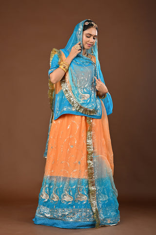 Peach Firozi Shaded Pure Georgette Rajputi Poshak featuring Aari Pittan with kasab Embroidery