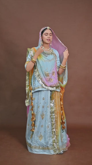 Designed for sophistication, this multi shaded odhna Rajputi Poshak in pure georgette highlights Zardozi and tiki. Ideal for occasion wear, it offers grace and regal appeal. An elegant pick for brides and connoisseurs of handcrafted Indian wear.