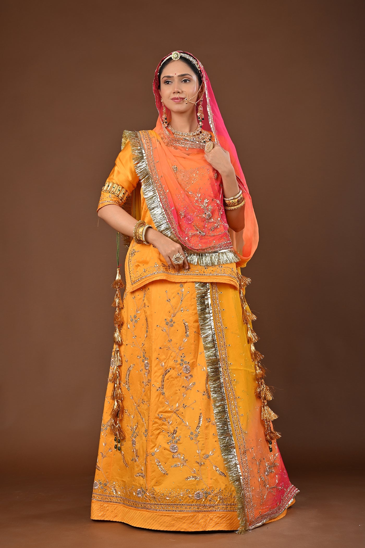 Radiating charm, this multi shaded odhna Rajputi Poshak is tailored in pure georgette and adorned with Zardozi and Kundan. A refined outfit for occasion wear, it blends heritage with modern style. An heirloom-worthy ensemble for women seeking authentic Rajputi Poshaks online.