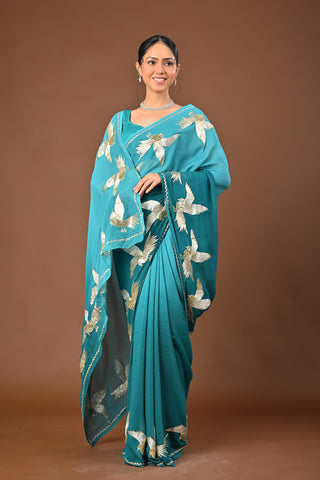 Shaded Teal Green Platinum Chiffon Saree with Aari Kasab Ganga Jamuni Bird Motif border with zardozi and sequins