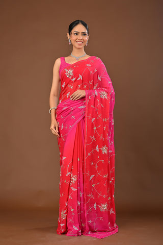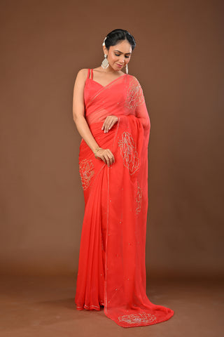 Shaded Rani Orange Platinum Chiffon Saree with Aari Kasab Jaal Highlight Kardhana with Zardozi Kasab Boota