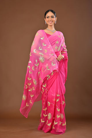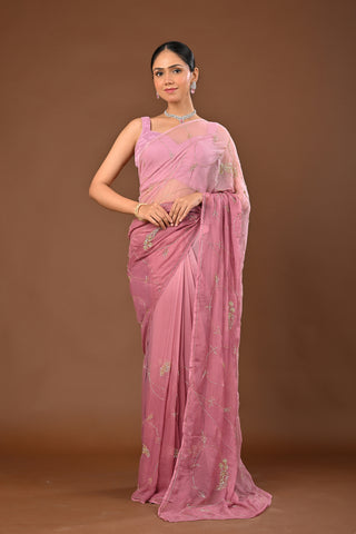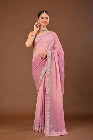Shaded Onion Pink Platinum Chiffon Saree with Jamdani Aari Kasab and Zardozi Border with persly motifs