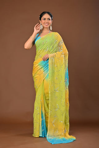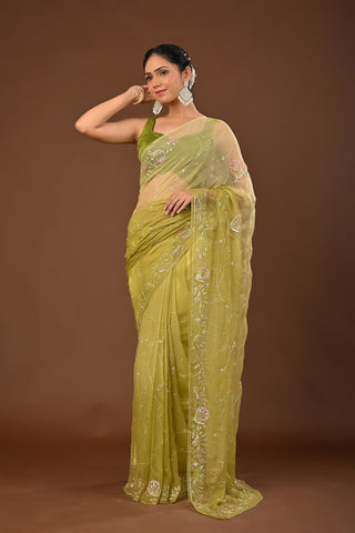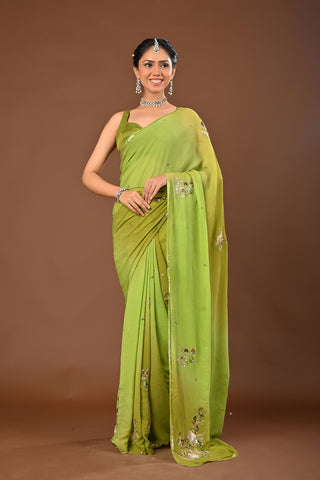 Shaded Mehendi Platinum Chiffon Saree with Gold and Silver Aari Kasab boota with Zardozi and copper sequins