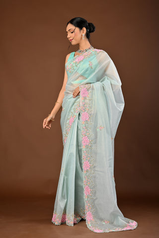 Sky Blue Saree in Crush Tissue featuring Cutdana and Pearl with Heavy Sequins