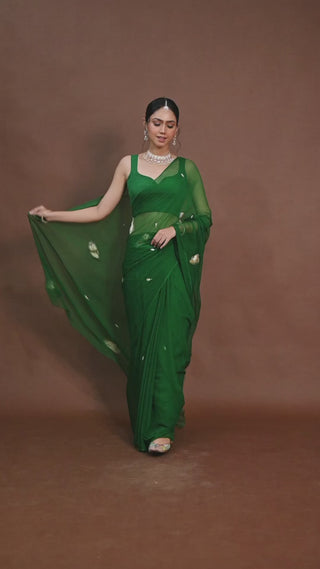 Radiating elegance, this bottle green chiffon saree is enhanced with Aari Kasab work with peopock feather motif. A refined choice for Party wear, blending tradition with modern appeal. An heirloom-worthy saree for women seeking authentic Indian elegance.