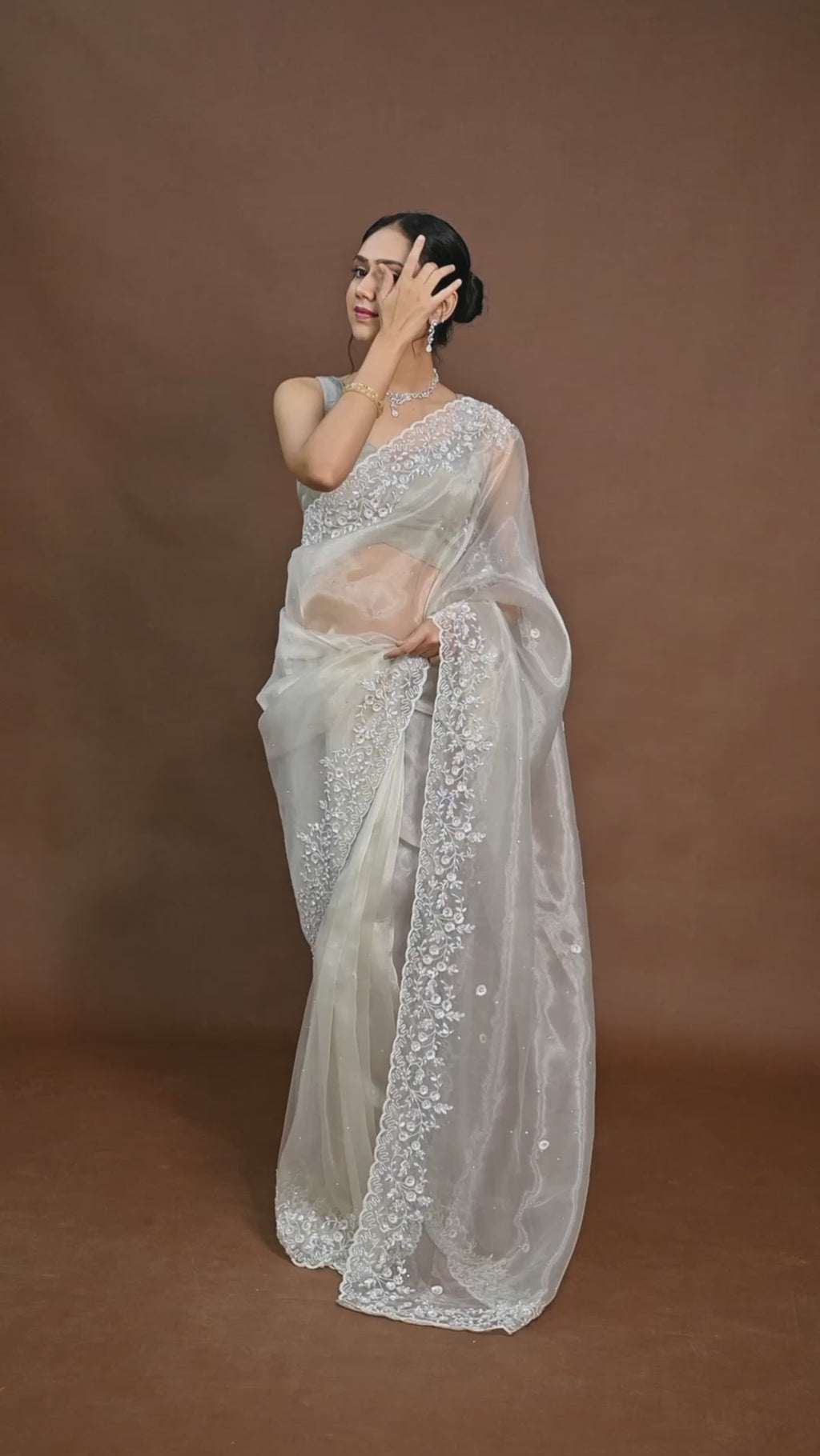 Refined from every angle, the sleek Steel Grey/Silver saree in tissue highlights White color cutdana and white sequins with stones all along border. A standout piece for receptions, sangeet and evening celebrations.