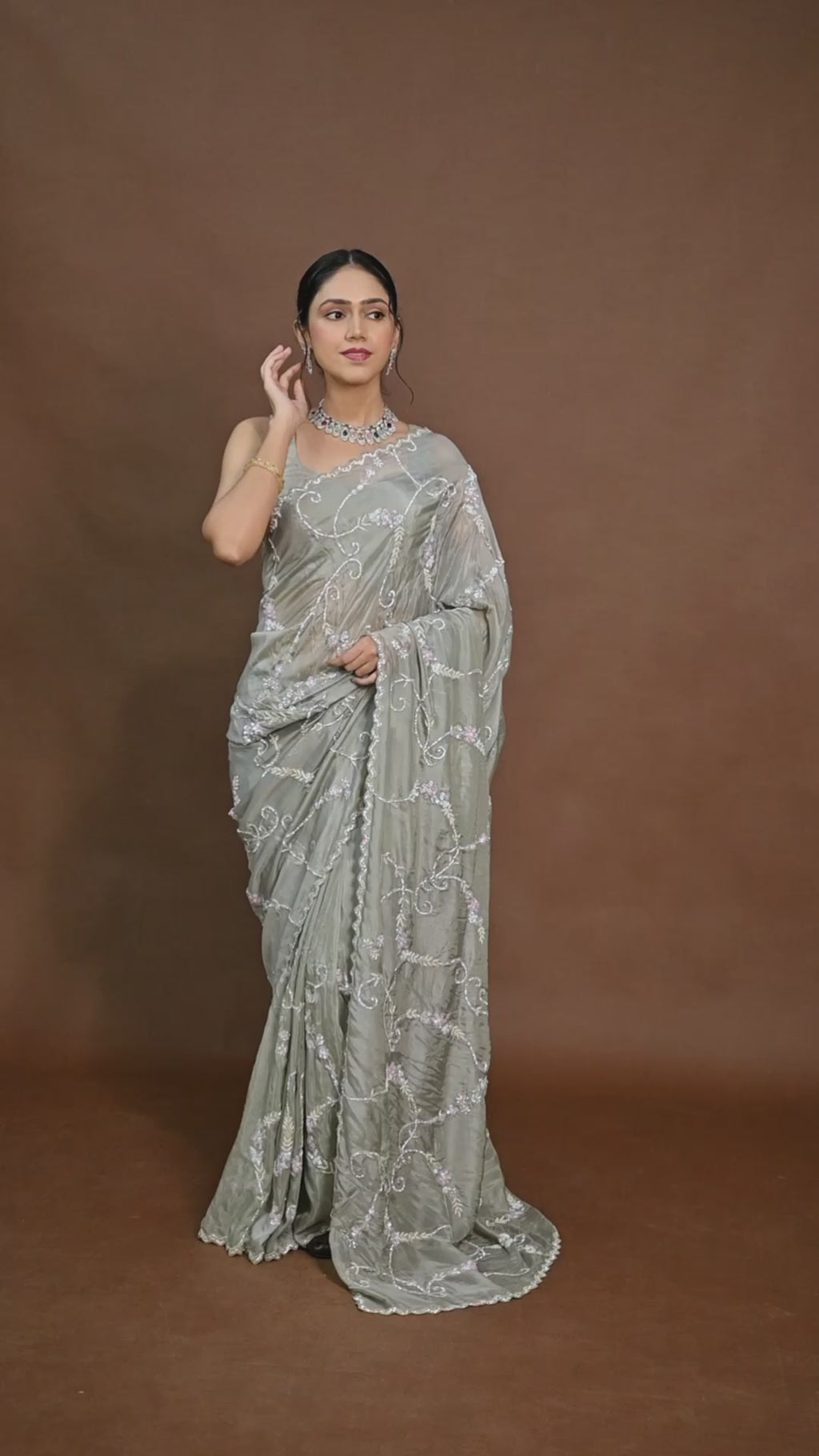 Radiant in sleek Grey, this buttery-soft silk drape saree is Heavy stone jaal with sequins and pearl work all over. A luxurious choice for receptions, sangeet and evening celebrations, finished with refined details.