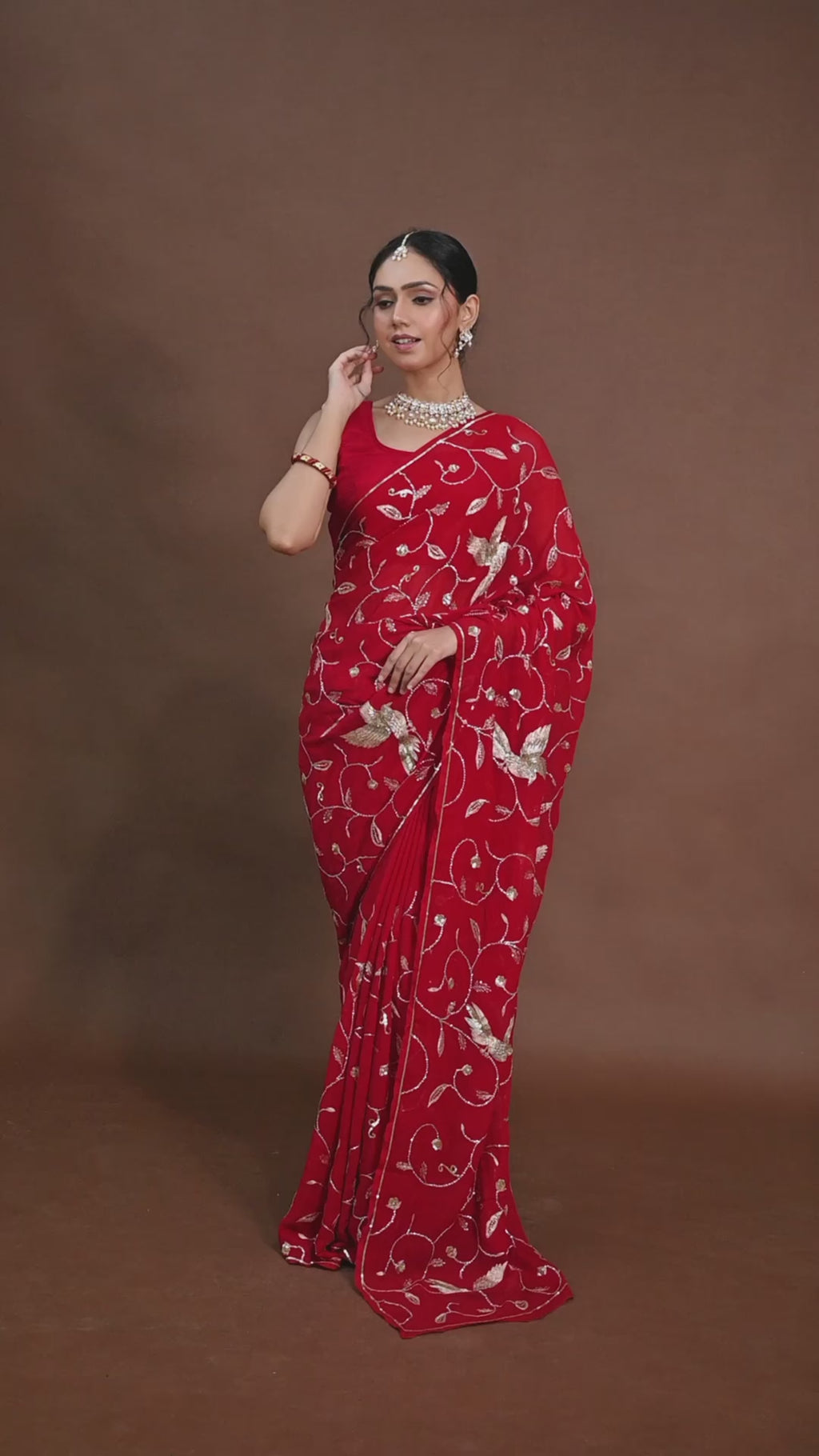A timeless pick, this red platinum chiffon saree comes adorned with Ulti Katori Jaal with aari kasab and zardozi bird motif. A luxurious ensemble for Party wear celebrations and gatherings. An elegant saree that celebrates both heritage and modern design.