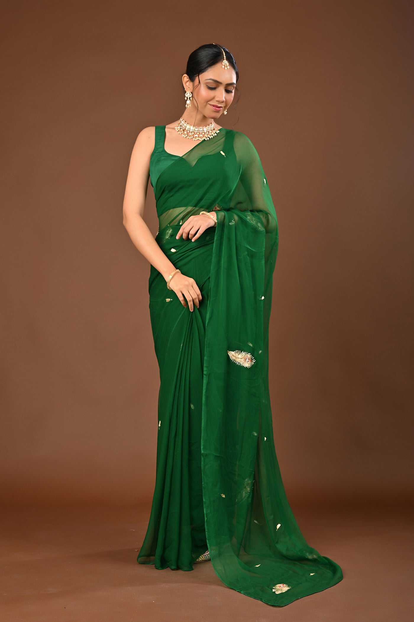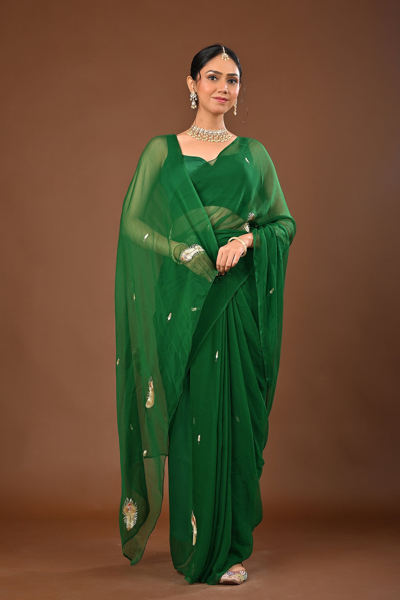 Radiating elegance, this bottle green chiffon saree is enhanced with Aari Kasab work with peopock feather motif. A refined choice for Party wear, blending tradition with modern appeal. An heirloom-worthy saree for women seeking authentic Indian elegance.