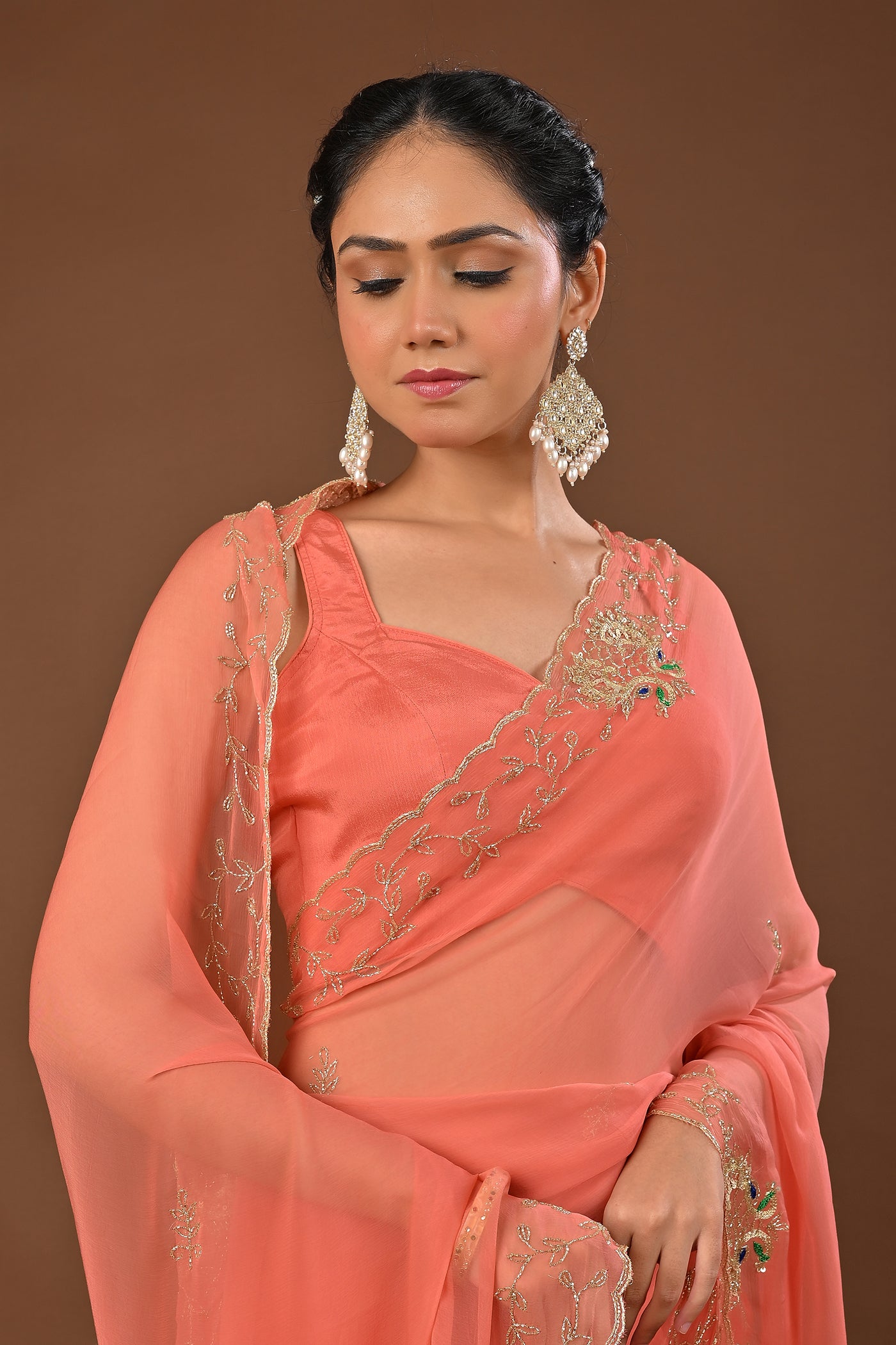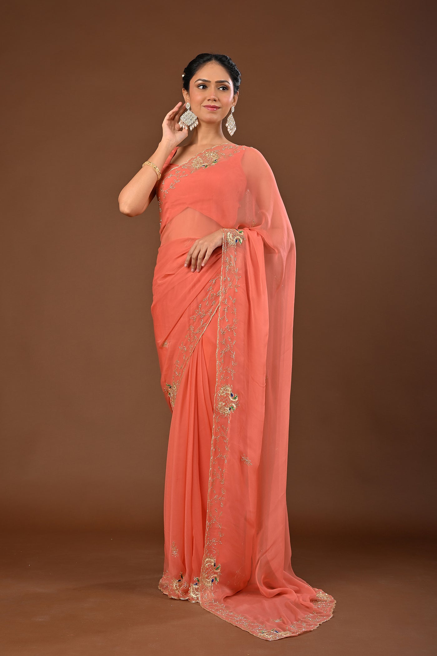 A timeless pick, this dusty peach chiffon saree comes adorned with Cutting Cutdana border with Peacock Motifs. A luxurious ensemble for Party wear celebrations and gatherings. An elegant saree that celebrates both heritage and modern design.