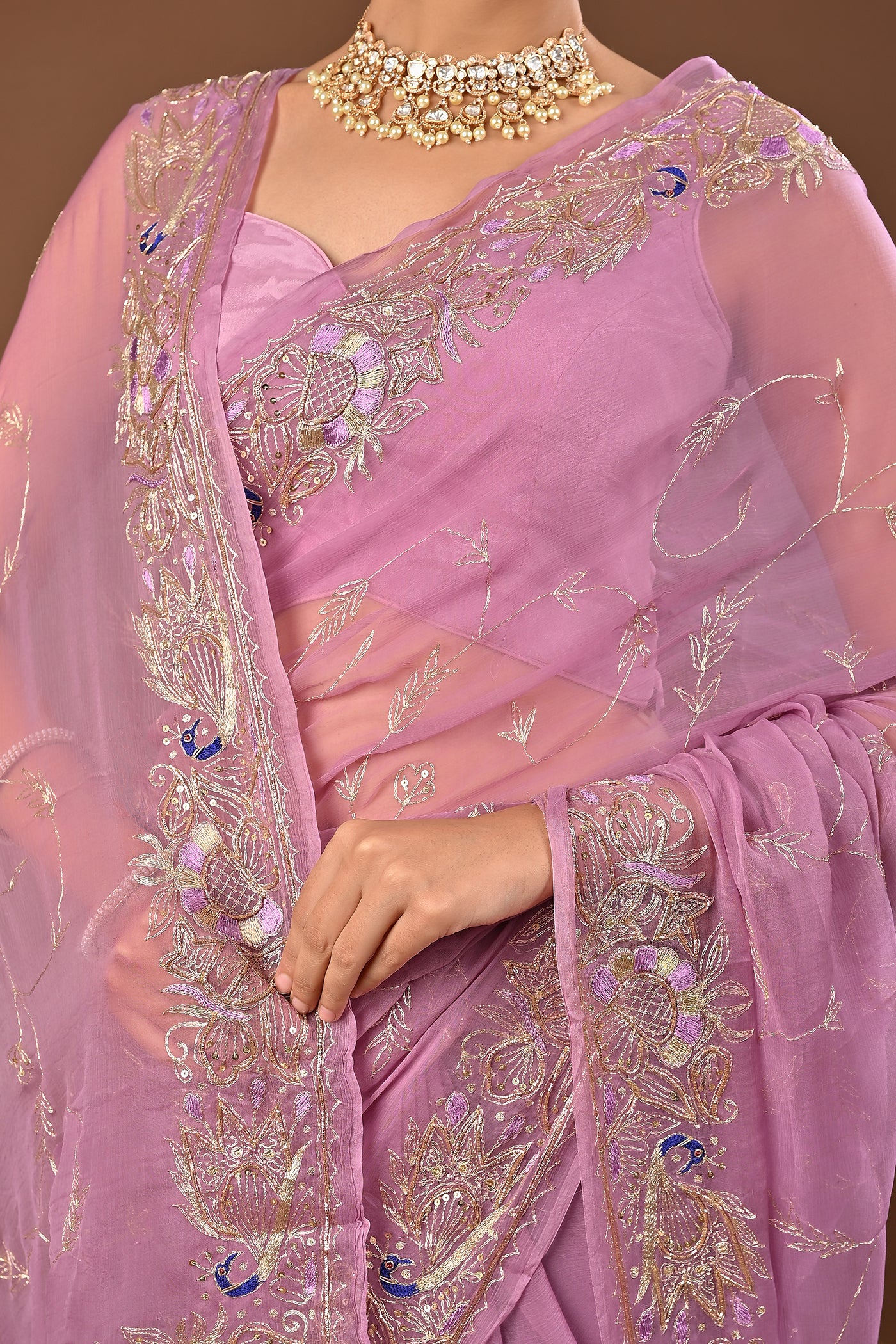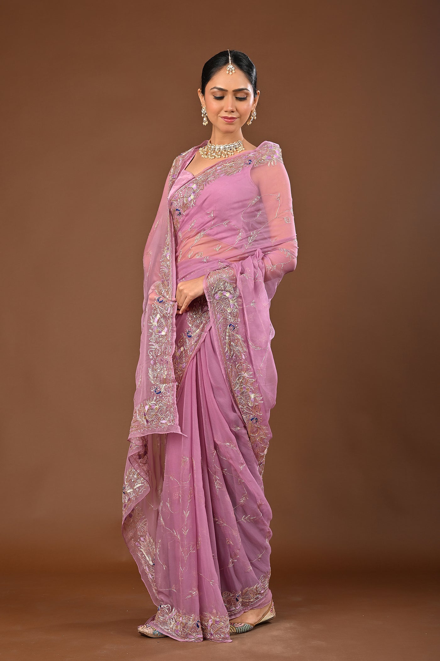 Designed for sophistication, this onion pink chiffon saree showcases Aari kasab, sequens and cutdana border. Perfect for Party wear, offering grace and comfort in every drape. A designer piece that elevates every special occasion effortlessly.