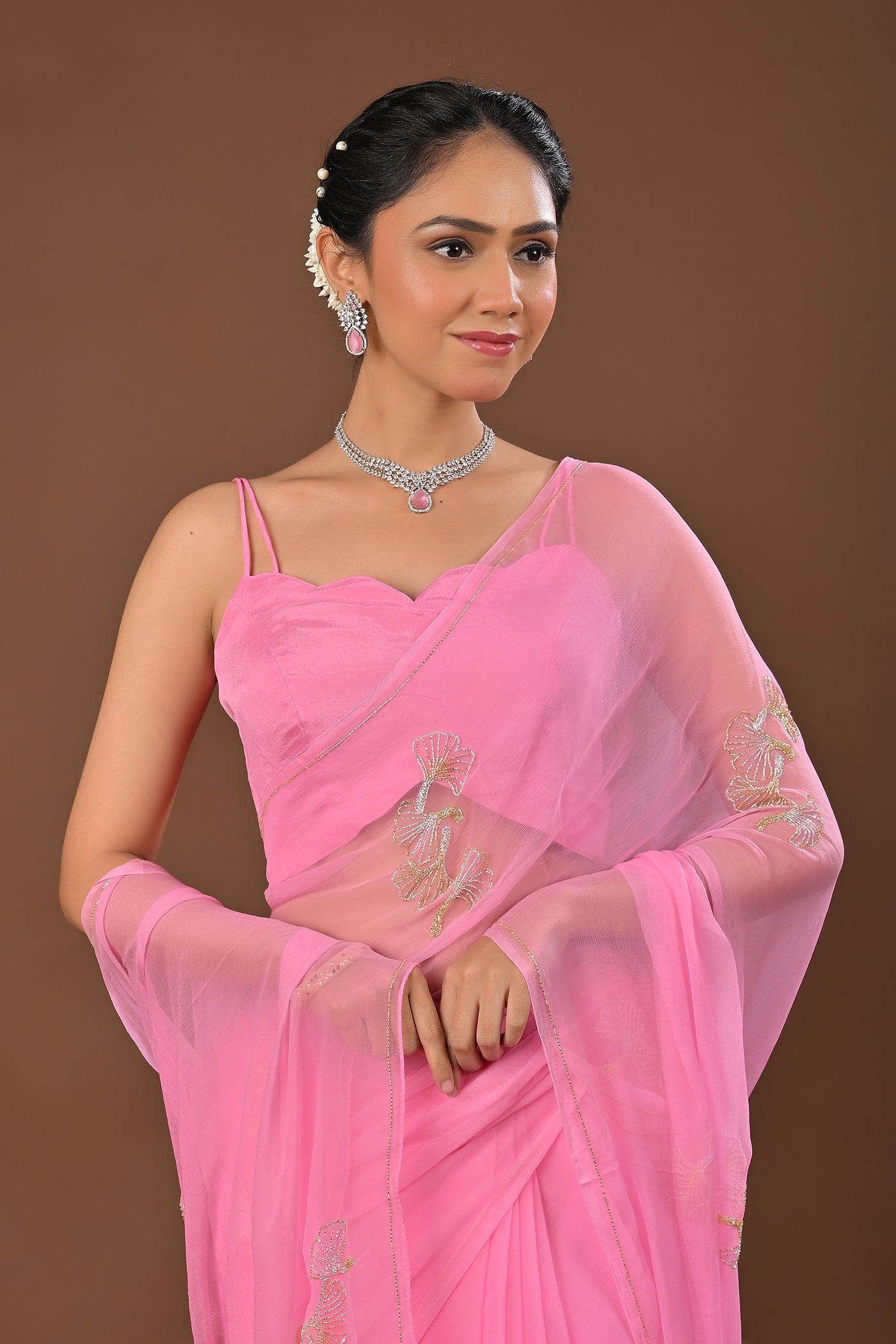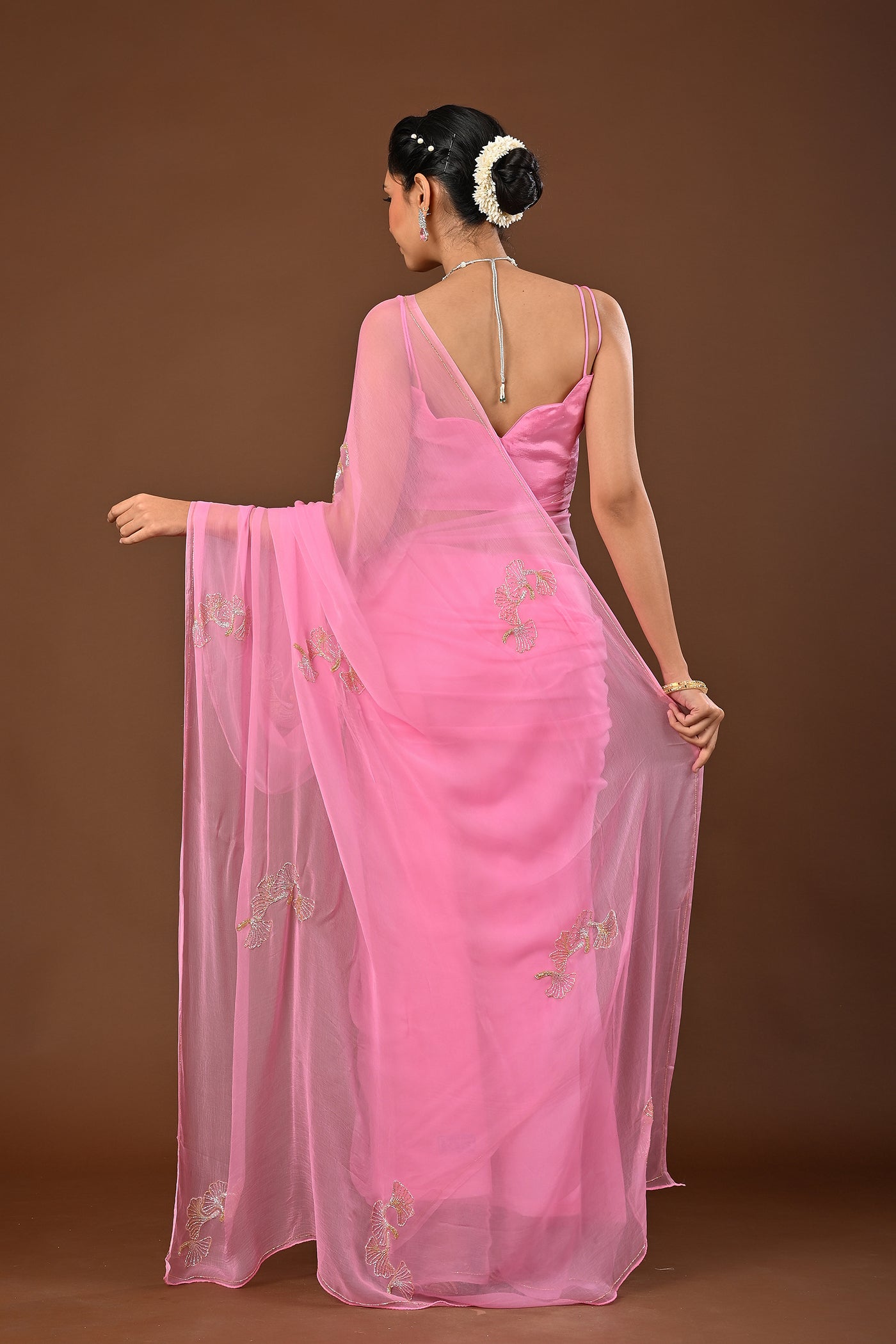 Pink Chiffon Saree with Gold and Silver Cutdana Boota