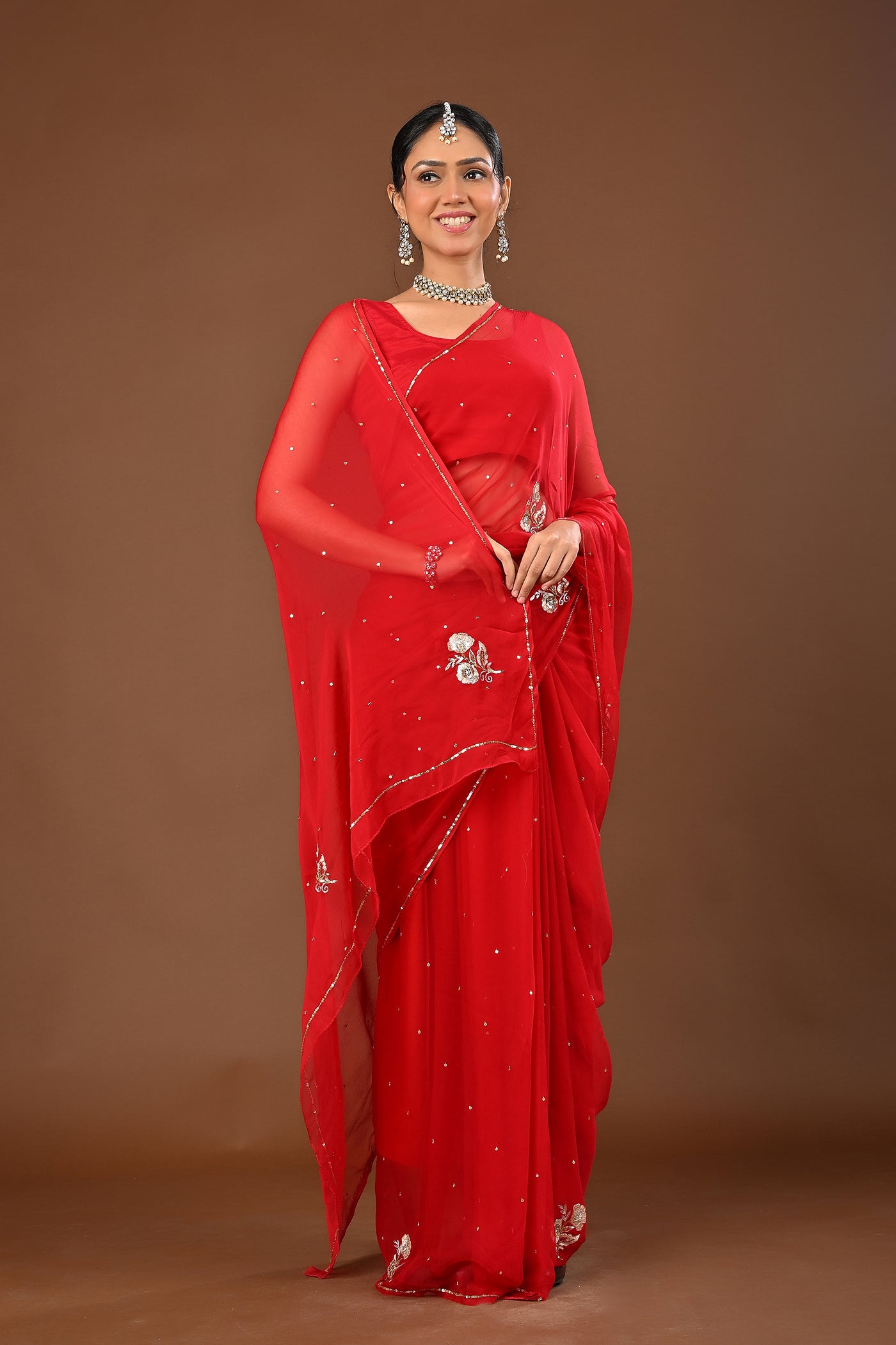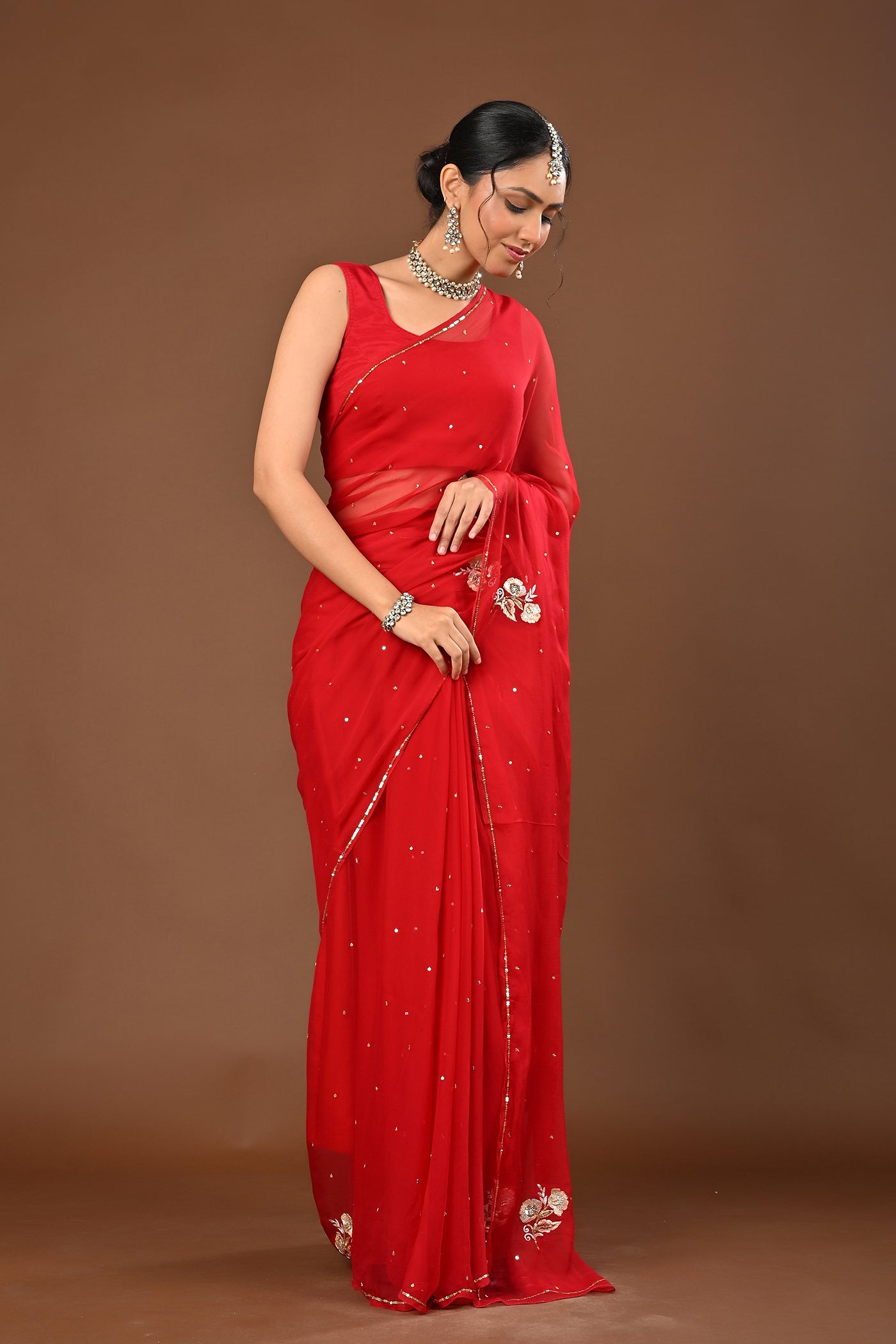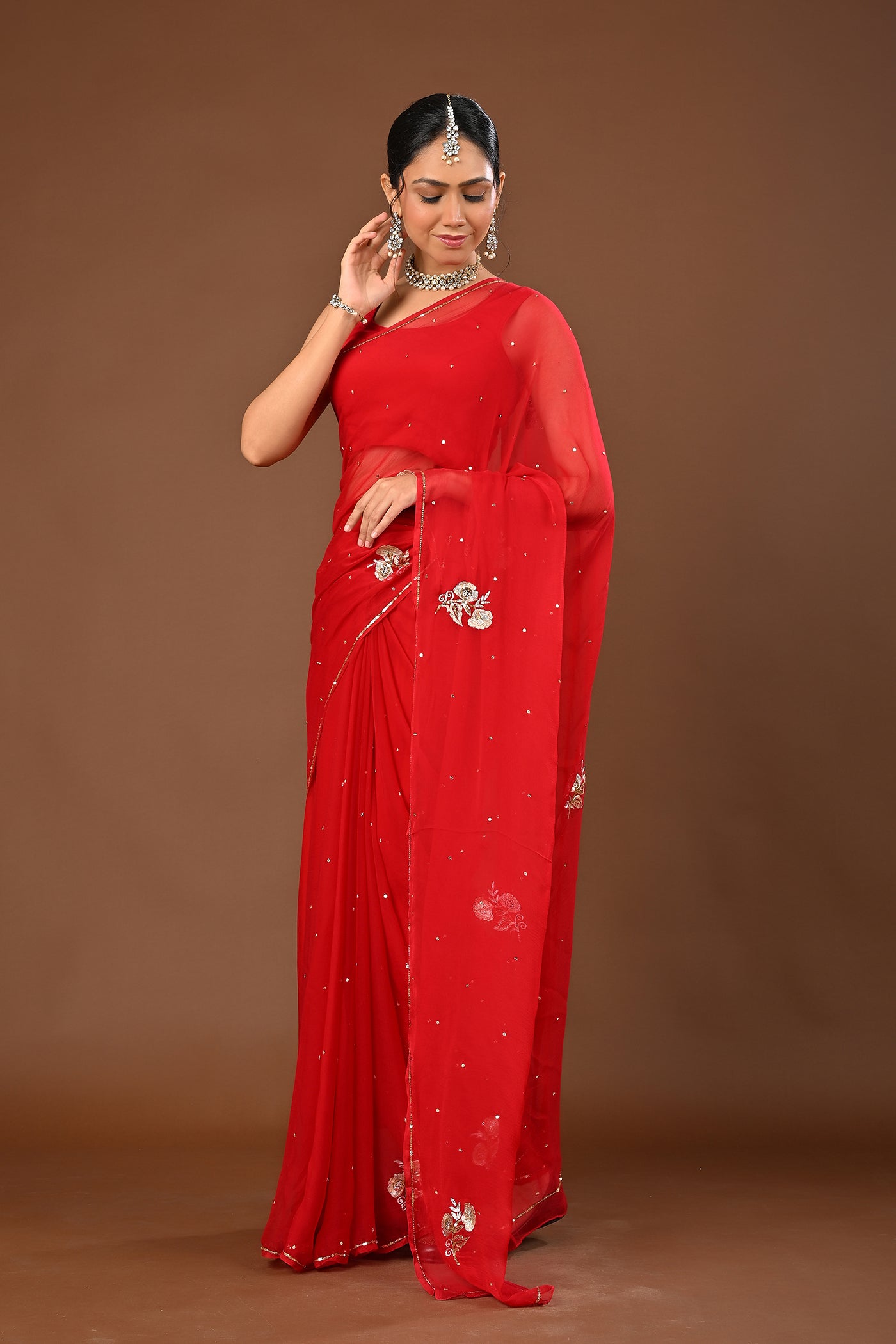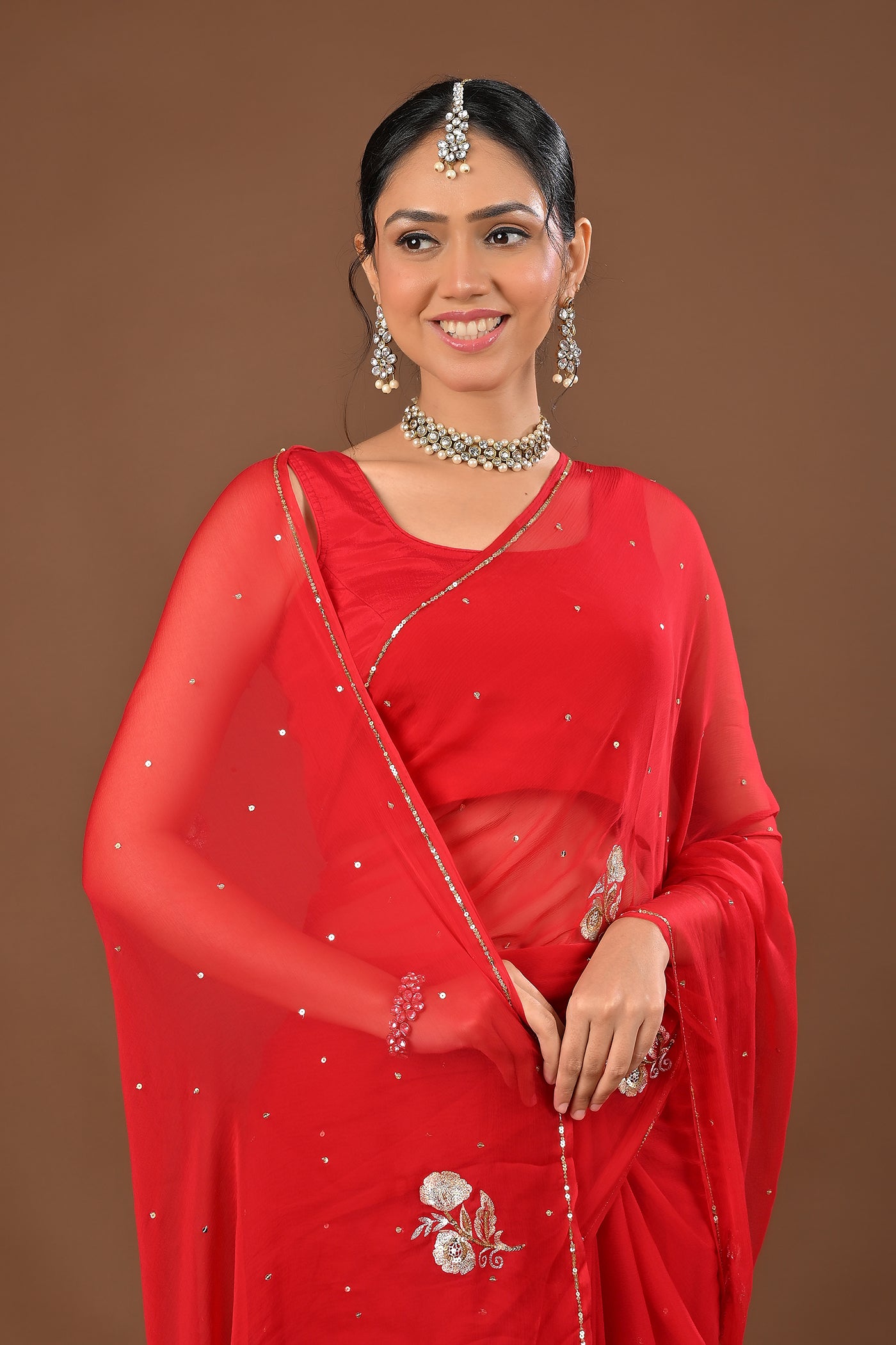 Red Chiffon Saree with Aari Kasab Cutting Jali boota with Zardozi and sequins