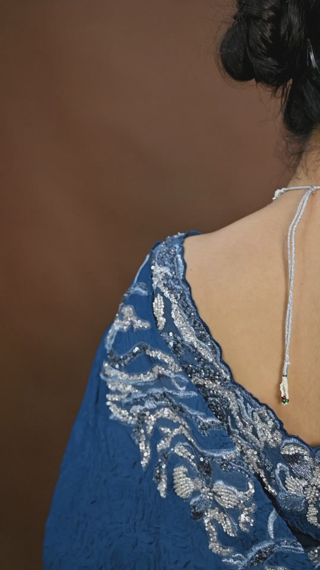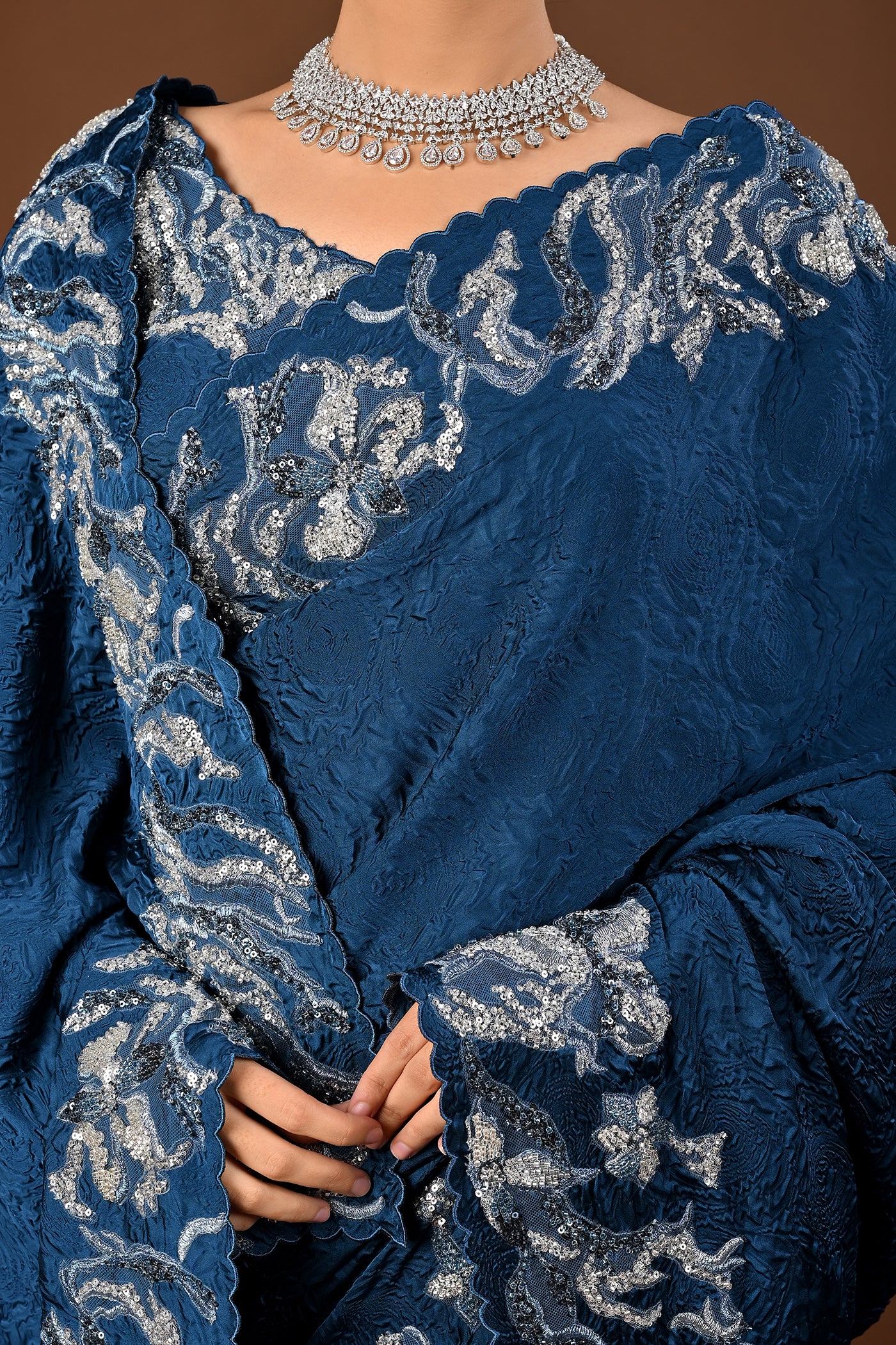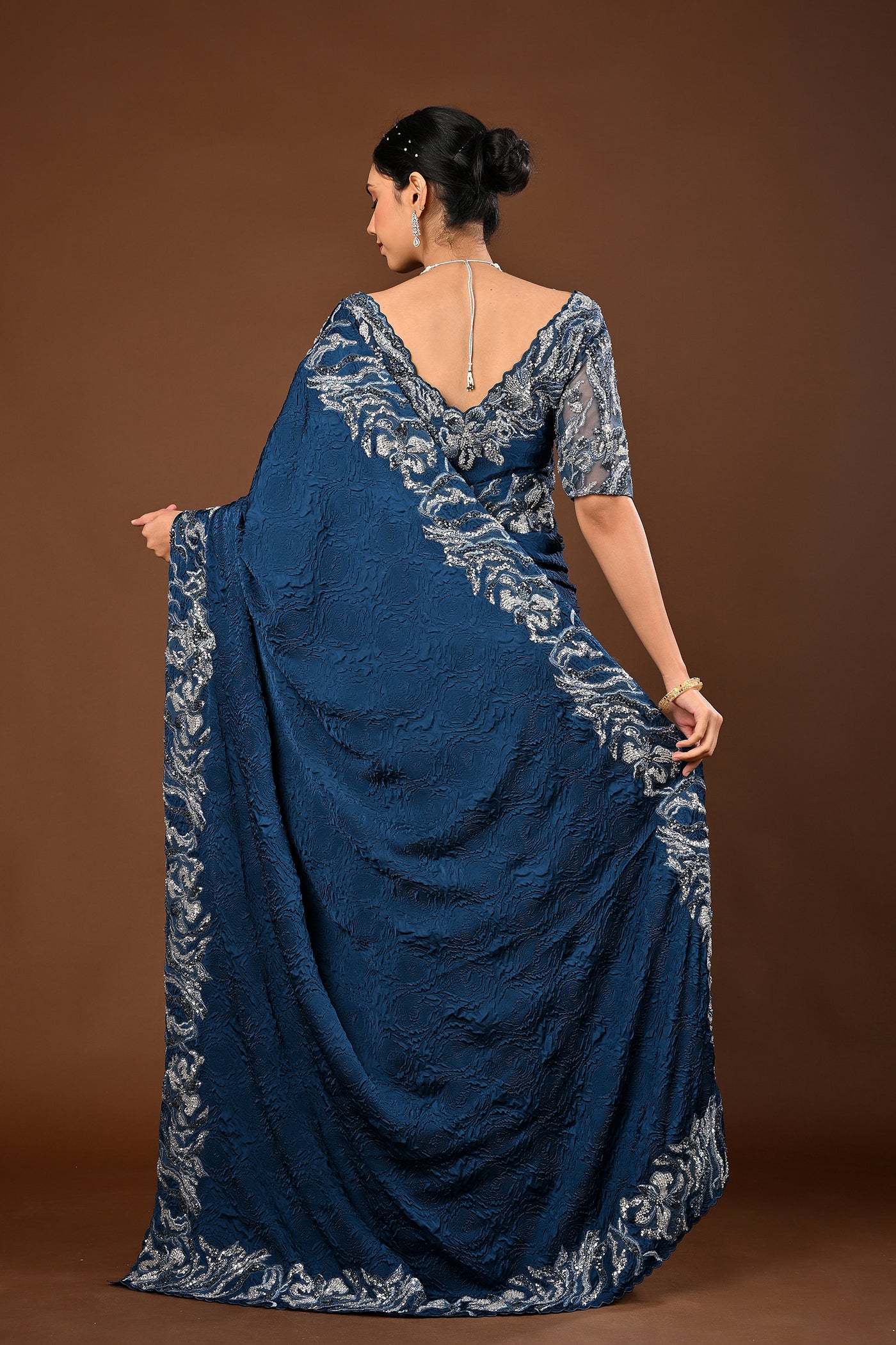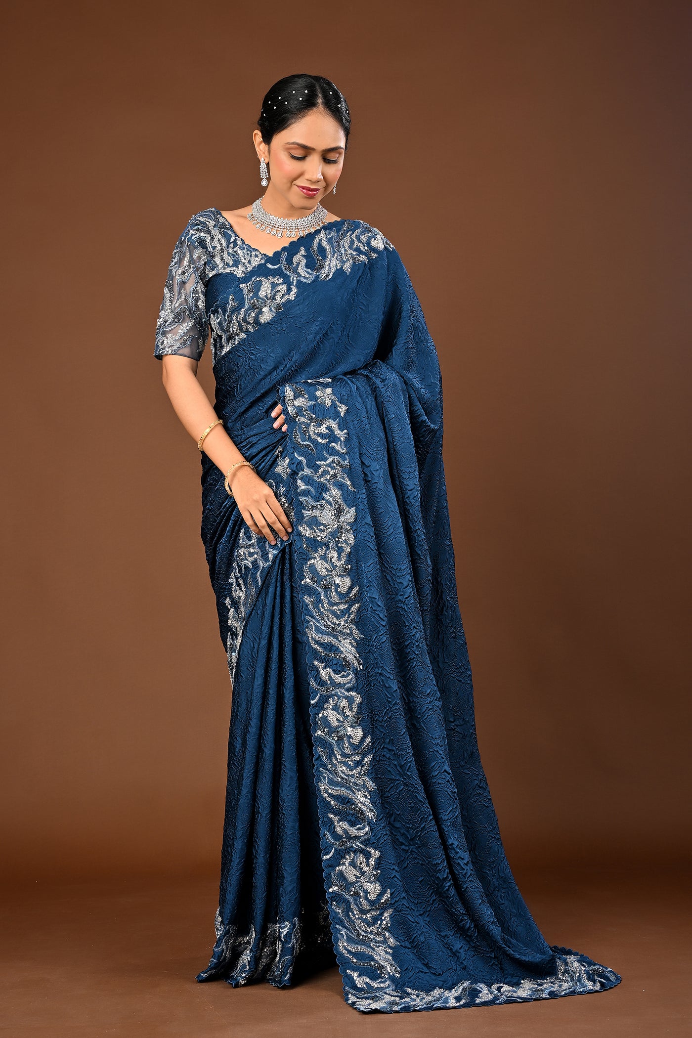 Effortless elegance defines this contemporary Teal Blue saree in imported lycra, finished with Patch work with cutdana and sequins with heavy blouse. An elevated pick for receptions, sangeet and evening celebrations.