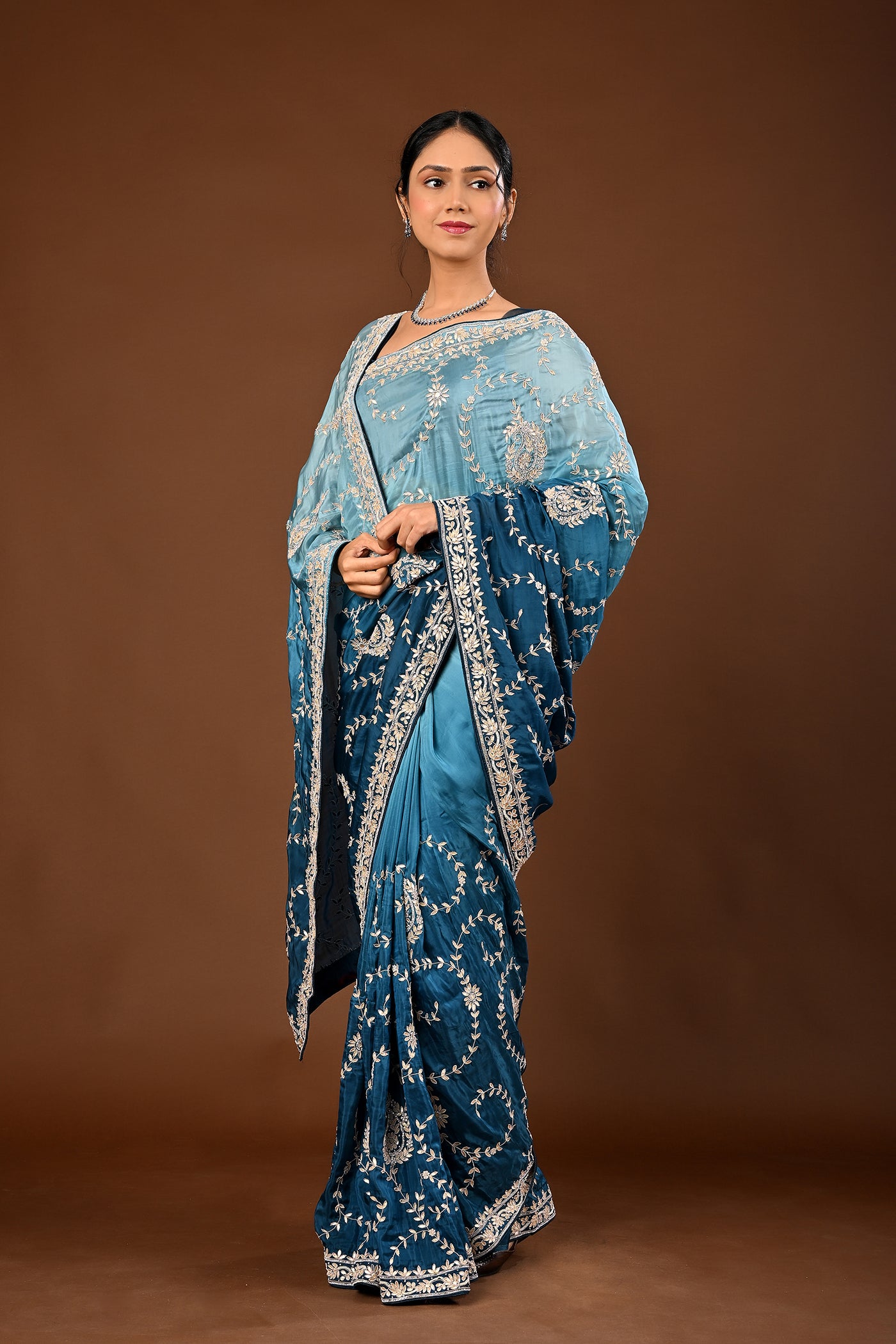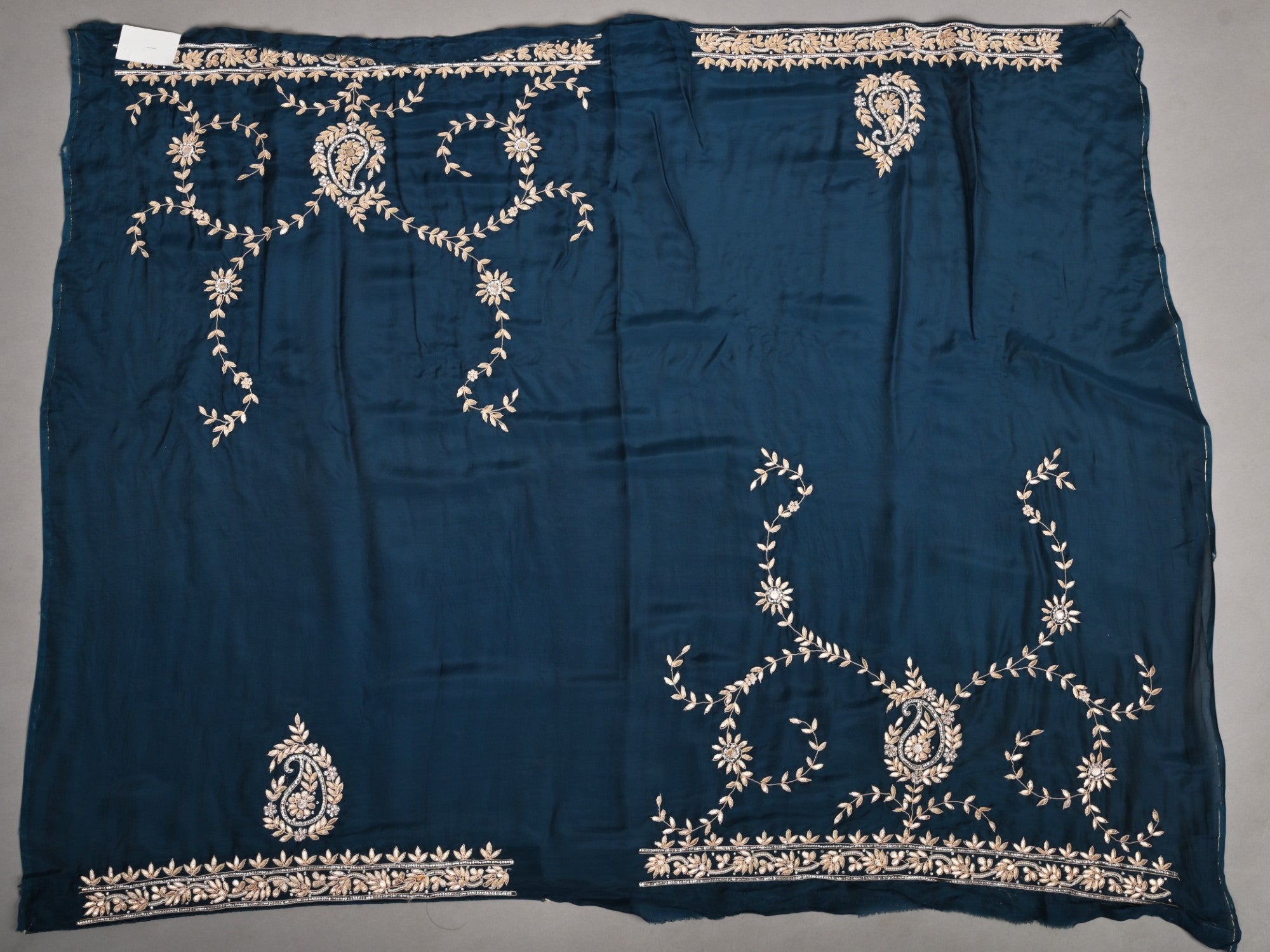 Radiant in contemporary Teal Blue, this buttery-soft silk drape saree is Gota Patti Jaal with Keri motifs and heavy blouse. A luxurious choice for weddings and festive functions, finished with refined details.