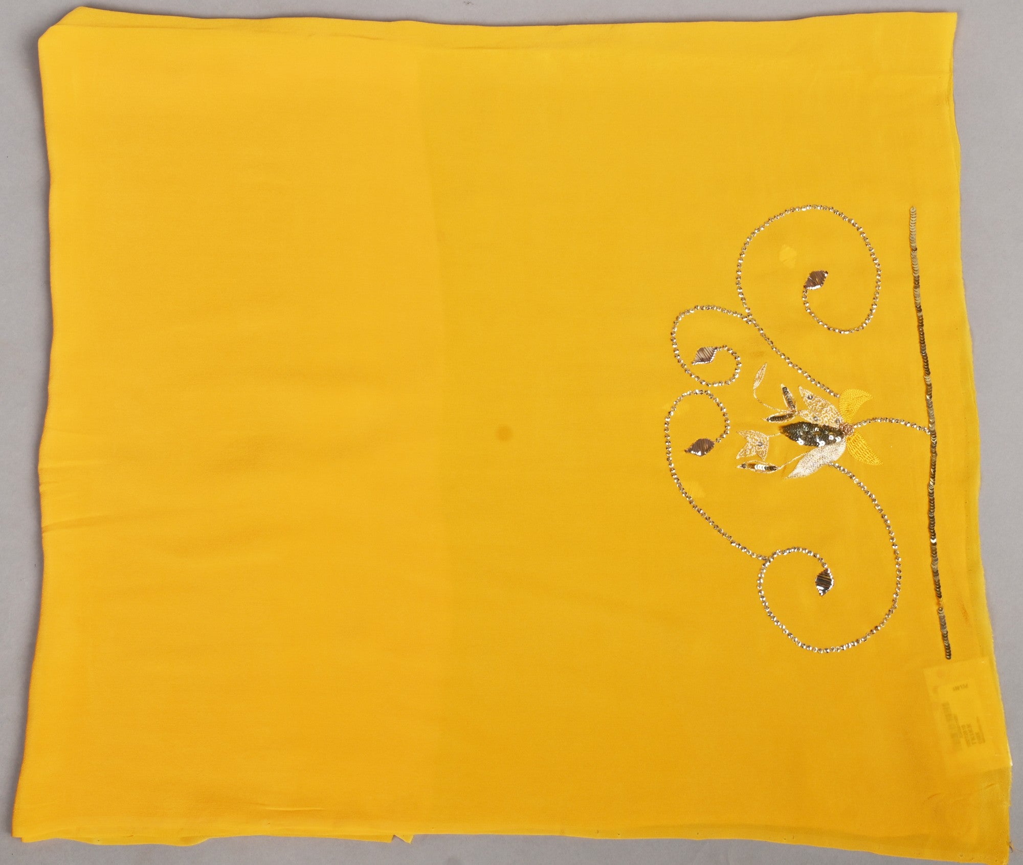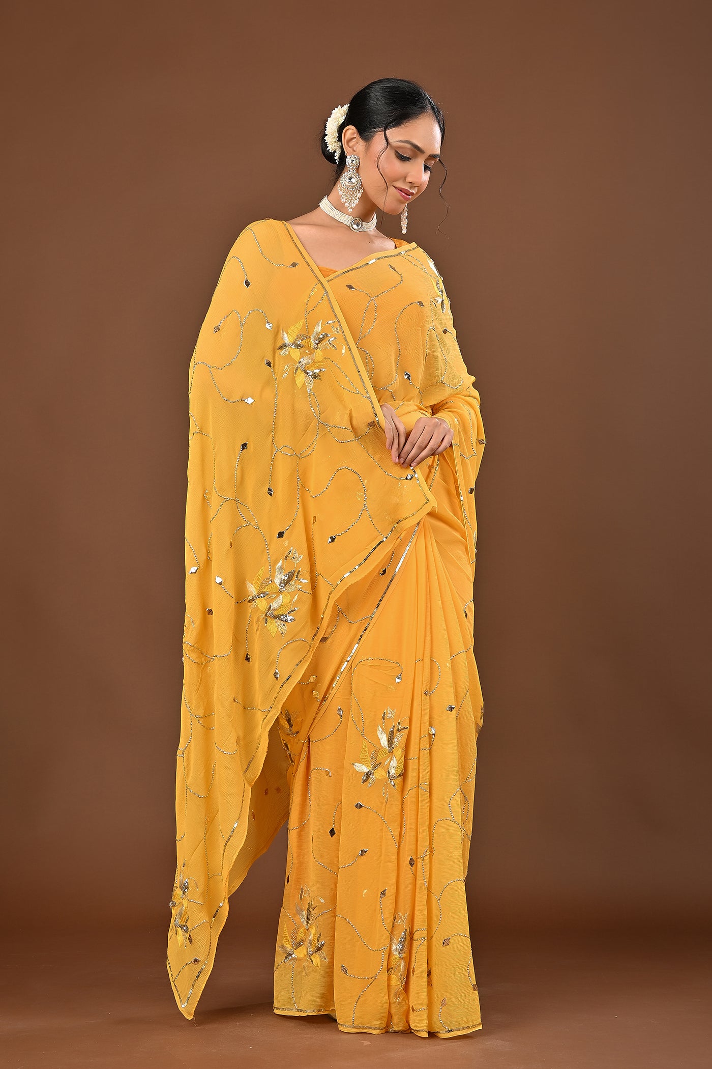 Yellow Platinum Chiffon Saree with Ulti Katori Jaal with Mukesh leafs