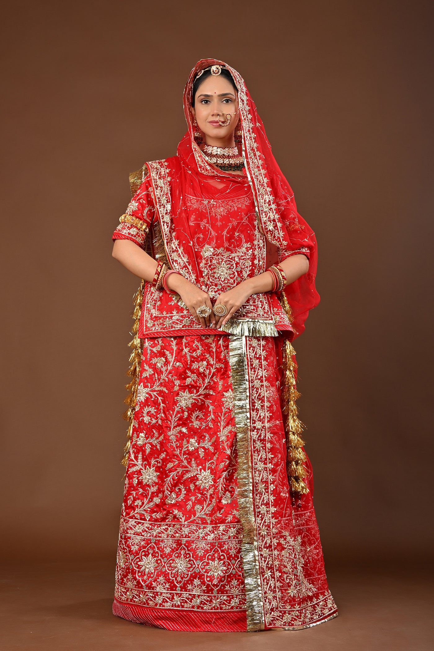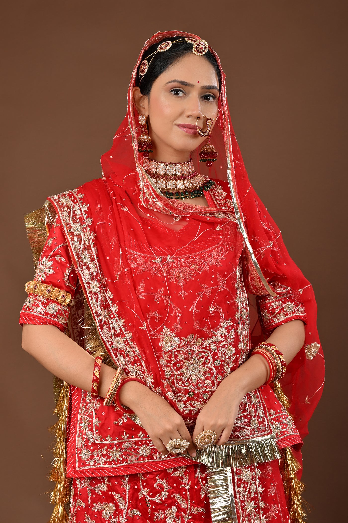 Radiating charm, this red Rajputi Poshak is tailored in pure georgette and adorned with Zardozi. A refined outfit for wedding, it blends heritage with modern style. An heirloom-worthy ensemble for women seeking authentic Rajputi Poshaks online.