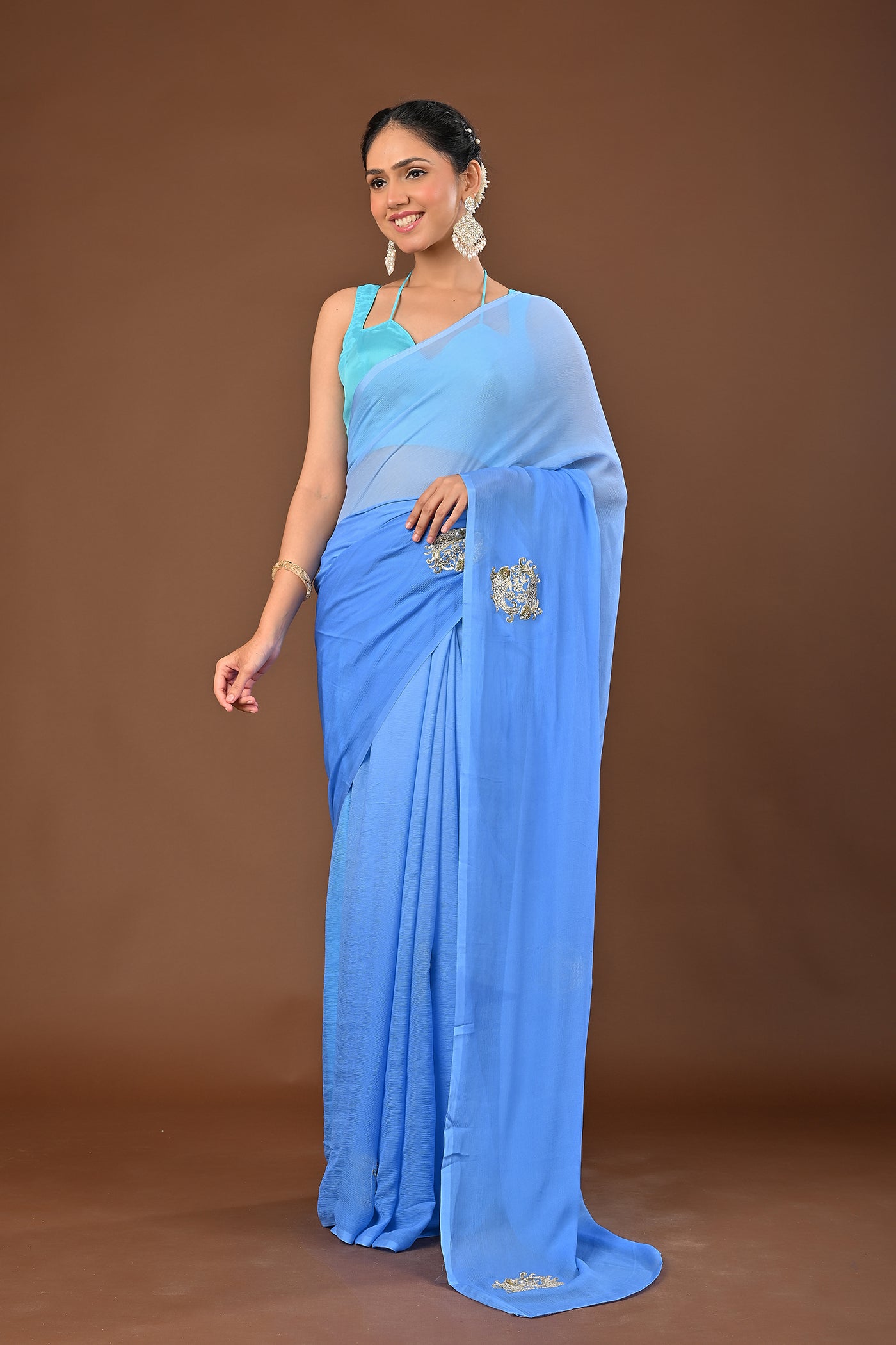 Step into grace with this greyish blue platinum chiffon saree featuring Cutting Kasab Fish Heavy Boota. Ideal for Party wear, it reflects exquisite craftsmanship. A versatile addition to your festive wardrobe, crafted with care.