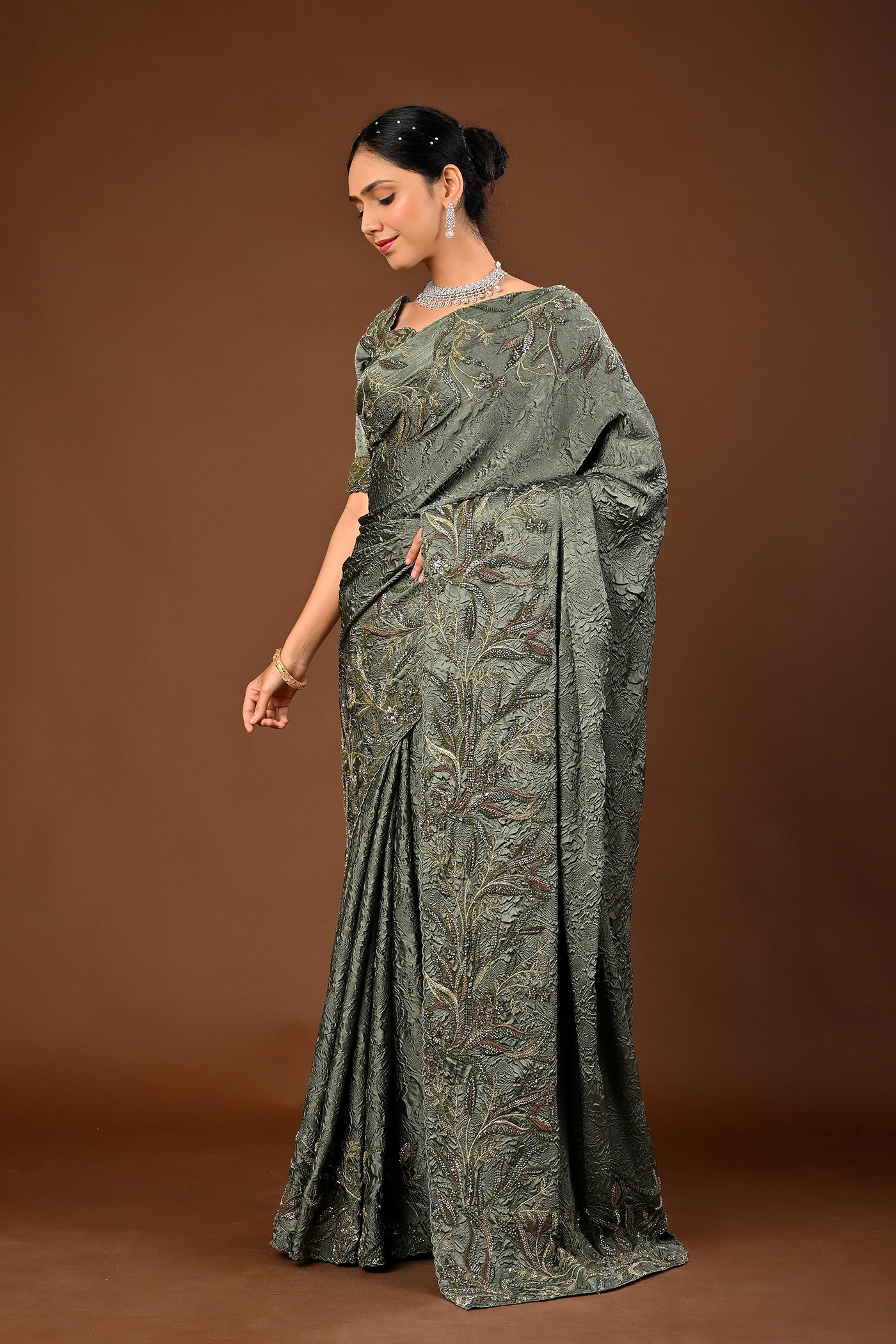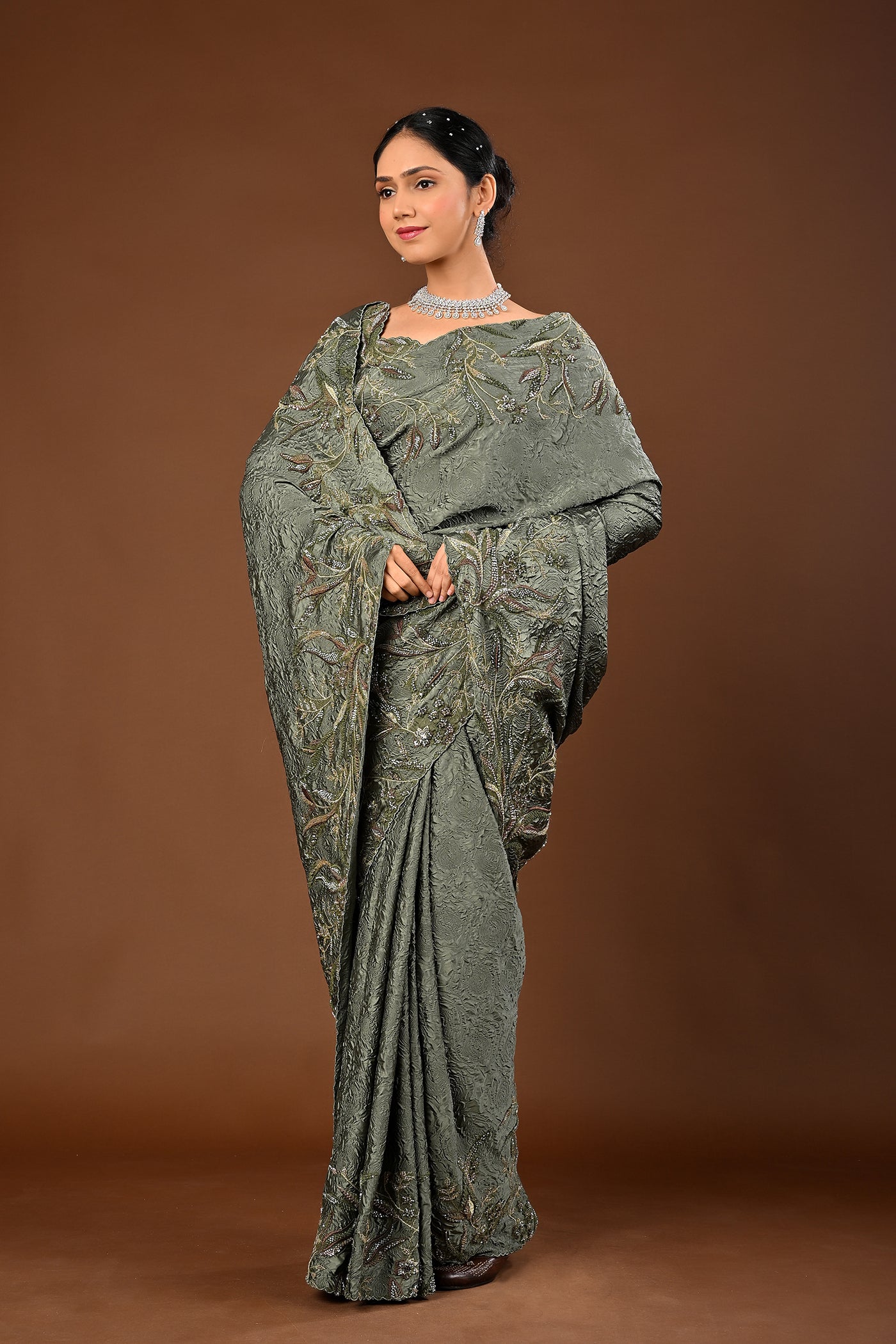 Understated luxury: a serene Matt Green saree in imported lycra enhanced with Cutdana and zari work with resham outlines. Suited to receptions, sangeet and evening celebrations.
